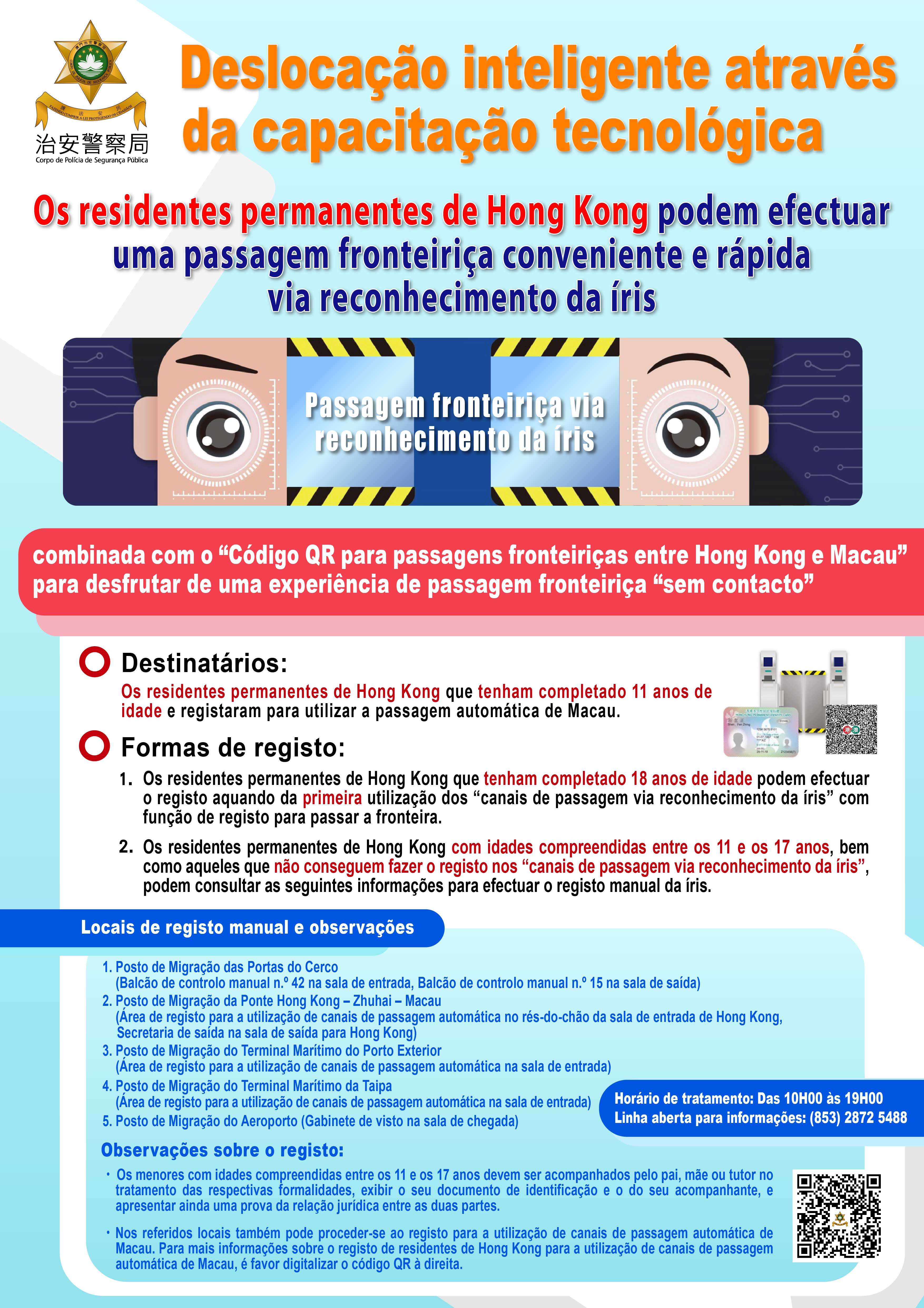 Os residentes permanentes de Hong Kong que tenham completado 11 anos de idade e registaram na passagem automática de Macau podem efectuar o registo da íris através das seguintes formas:
