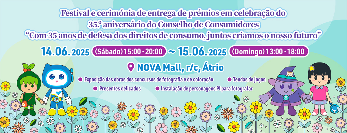 O Conselho de Consumidores (CC) realizará, nos dias 14 e 15 de Junho, no átrio do NOVA Mall, o Festival e cerimónia de entrega de prémios em celebração do 35.º aniversário do Conselho de Consumidores, subordinado ao tema “Com 35 anos de defesa dos direitos de consumo, juntos criamos o nosso futuro”, onde serão apresentados os serviços do CC aos cidadãos através das actividades e jogos interactivos, nomeadamente os pontos para fotografar, a sessão de fotografia com as personagens PI e as tendas de jogos, de maneira a reforçar a consciência dos consumidores pela protecção dos seus direitos. É bem-vinda a participação de todos cidadãos nesse festival.