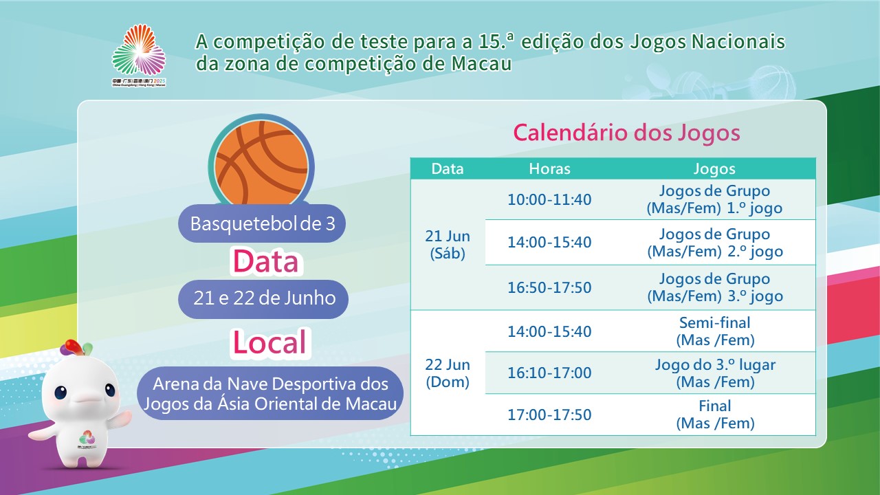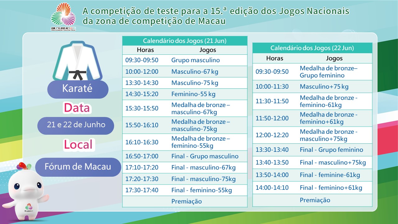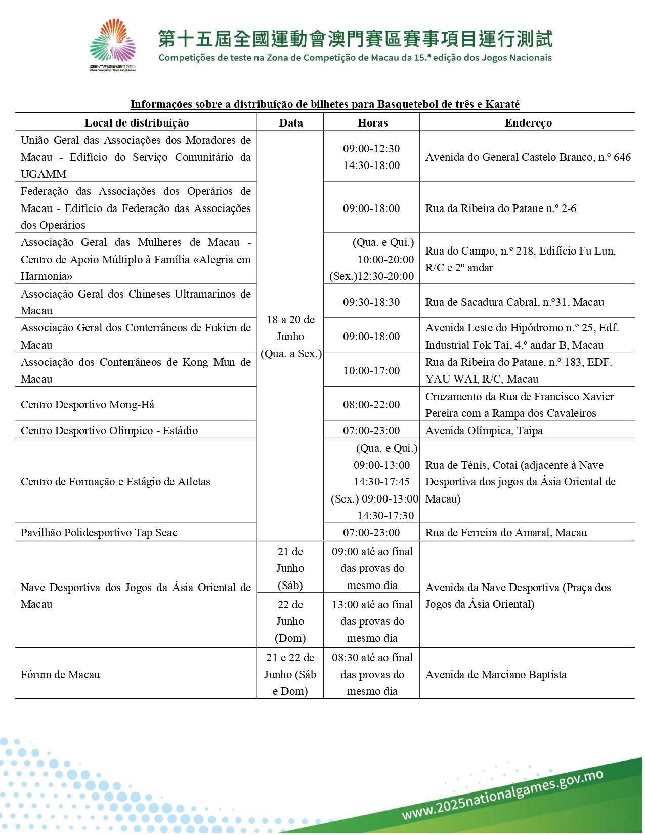 O Gabinete Preparatório para a Organização da Zona de Competição de Macau da 15.ª edição dos Jogos Nacionais e Jogos Olímpicos Especiais para Deficientes (adiante designado por Gabinete Preparatório) irá realizar as competições de teste nos dias 21 e 22 de Junho, para as modalidades de basquetebol de três e de karaté da 15.ª edição dos Jogos Nacionais da Zona de Competição de Macau que terão lugar, respectivamente, na Arena da Nave Desportiva dos Jogos da Ásia Oriental de Macau e no Fórum de Macau. Os bilhetes vão ser distribuídos gratuitamente a partir de 18 de Junho. Os residentes e turistas são bem-vindos a assistir aos jogos ao vivo.