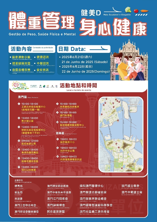 • A iniciativa “Gestão de Peso, Saúde Física e Mental” terá lugar este fim-de-semana, em 13 postos comunitários de atendimento e informação em toda a RAEM, promovendo a saúde física e mental dos residentes