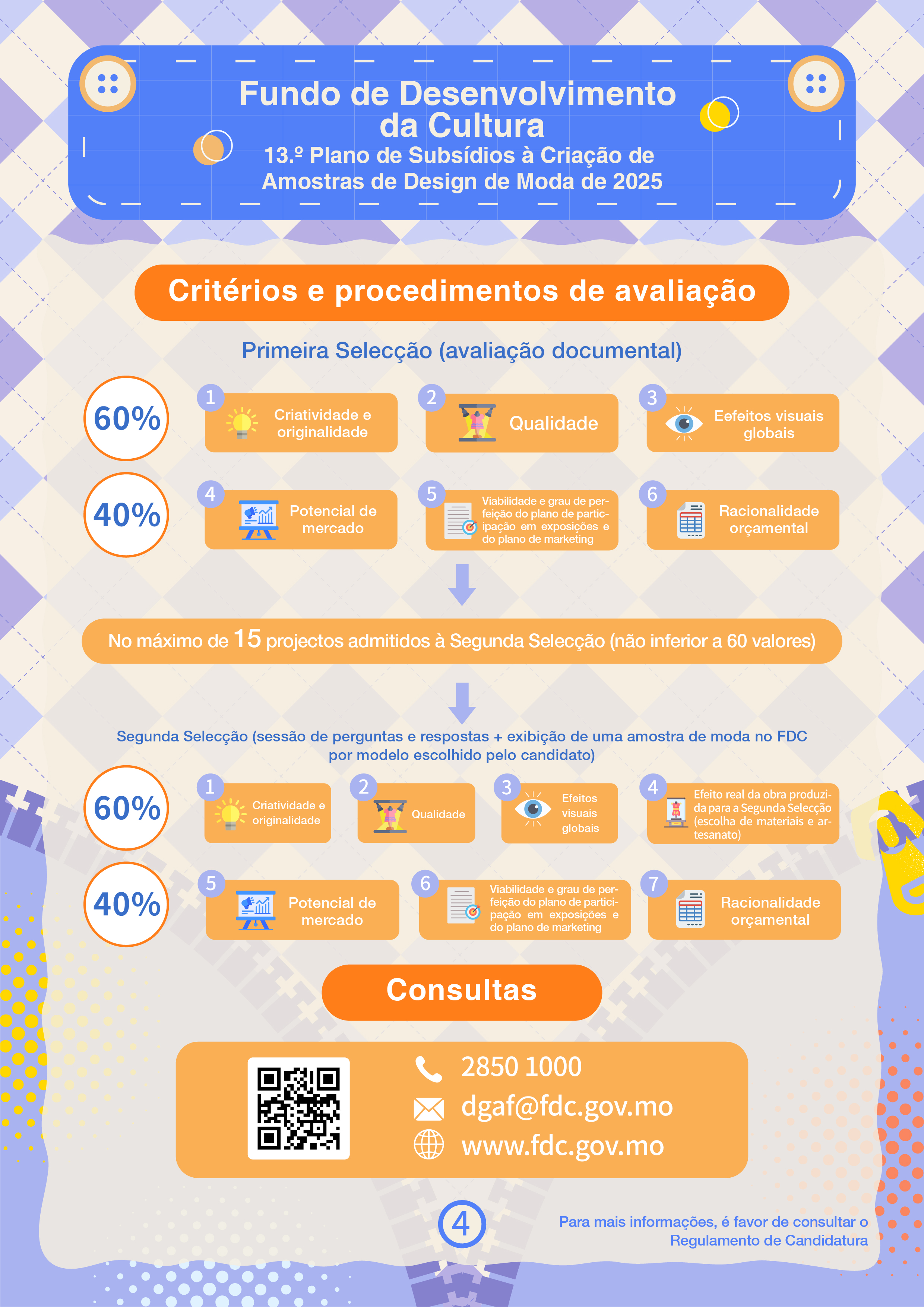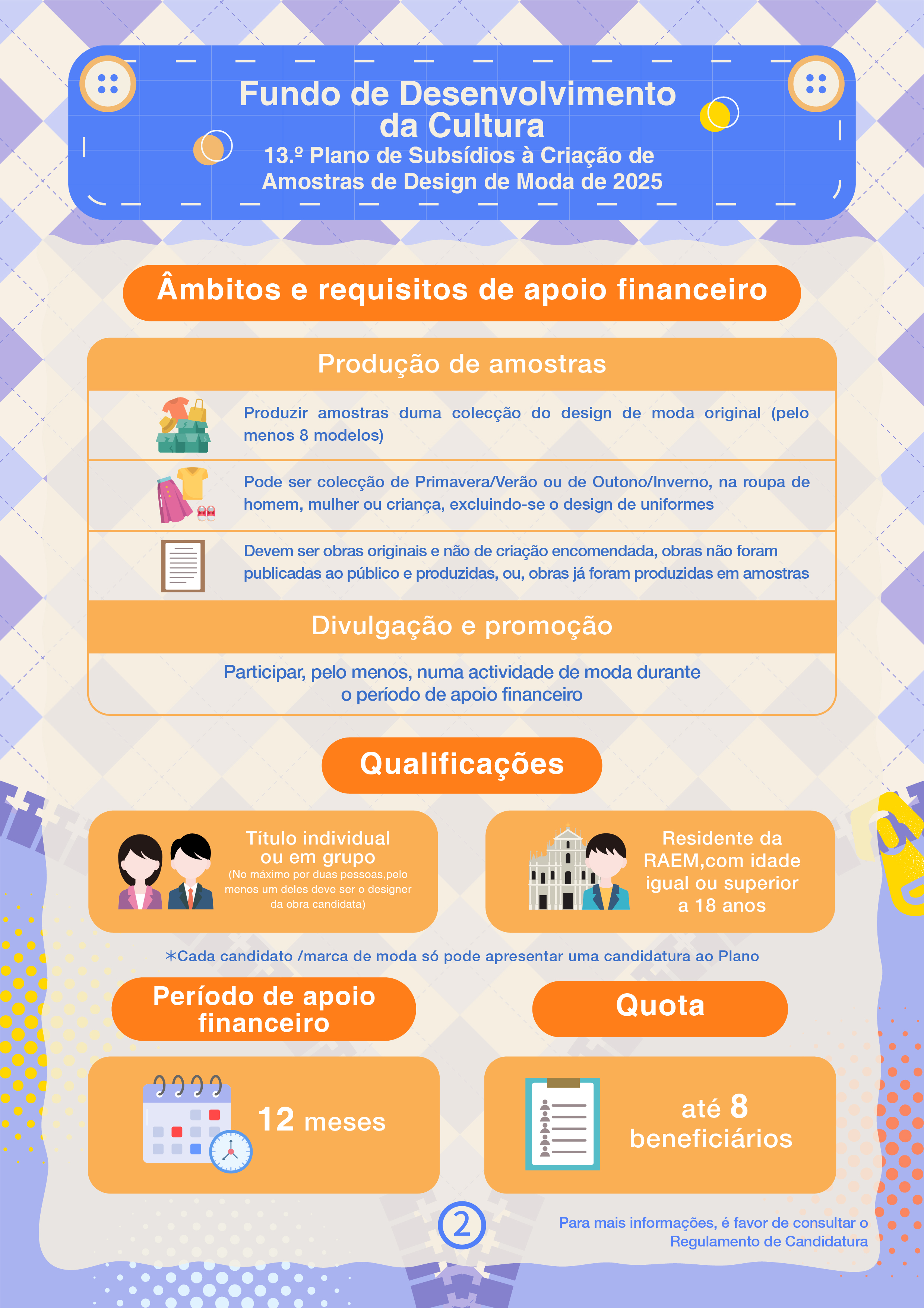 O Fundo de Desenvolvimento da Cultura (FDC) irá aceitar candidaturas, de 24 de Junho a 1 de Agosto, ao “13.º Plano de Subsídio à Criação de Amostras de Design de Moda”, com o objectivo de apoiar a produção de amostras e a promoção de colecções de moda originais de designers locais, impulsionando continuadamente o desenvolvimento da indústria do design de moda em Macau.