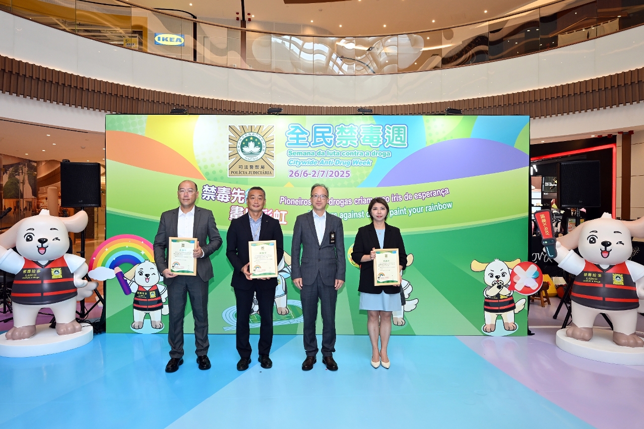 A campanha “Semana da luta contra a droga” realiza-se no NOVA Mall da Taipa no período de 26 de Junho a 2 de Julho, e a sua cerimónia de abertura teve lugar ao meio dia do primeiro dia da iniciativa. Foram convidados para presidir a cerimónia o 1.º subchefe de Gabinete da Comissão de Combate à Droga da província de Guangdong, chefe de Brigada Geral de Luta Contra a Droga da Directoria Provincial de Segurança Pública de Guangdong, LIU Weiguo, o presidente permanente da Associação de Administração de Propriedades de Macau também convocador-geral do Grupo “Amigos da Prevenção Criminal na Área da Habitação” da PJ, LAO Ngai Leong, a presidente da União Geral das Associações dos Moradores de Macau, NG Siu Lai, a presidente da direcção da Associação Geral das Mulheres de Macau, UN Sio Leng, o vice-presidente da Federação das Associações dos Operários de Macau, LEONG Pou U, o presidente da direcção da Associação Geral dos Chineses Ultramarinos de Macau, BI Chi Kin, o presidente da direcção da Aliança de Povo de Instituição de Macau, LEI Leong Wong, a presidente da direcção da Associação de Administração de Propriedades, SIT Un Na, o vice-presidente da Associação dos Técnicos Profissionais da Administração de Imóveis, CHUI Sio Man, o presidente da Associação de Profissionais do Sector da Administração de Propriedades de Macau, CHAO Ka Chon, a vice-presidente da direcção da Associação de Educação de Macau, IEONG Pui Ian, a directora de escola e vogal da direcção da Associação das Escolas Católicas de Macau, NG Sai Wa, o General Manager do NOVA Mall, Paul LEE e o director da PJ, SIT Chong Meng. Estiveram também presentes no evento os subdirectores da PJ, LAI Man Vai, SOU Sio Keong, SAM Kam Weng e as várias chefias da PJ.