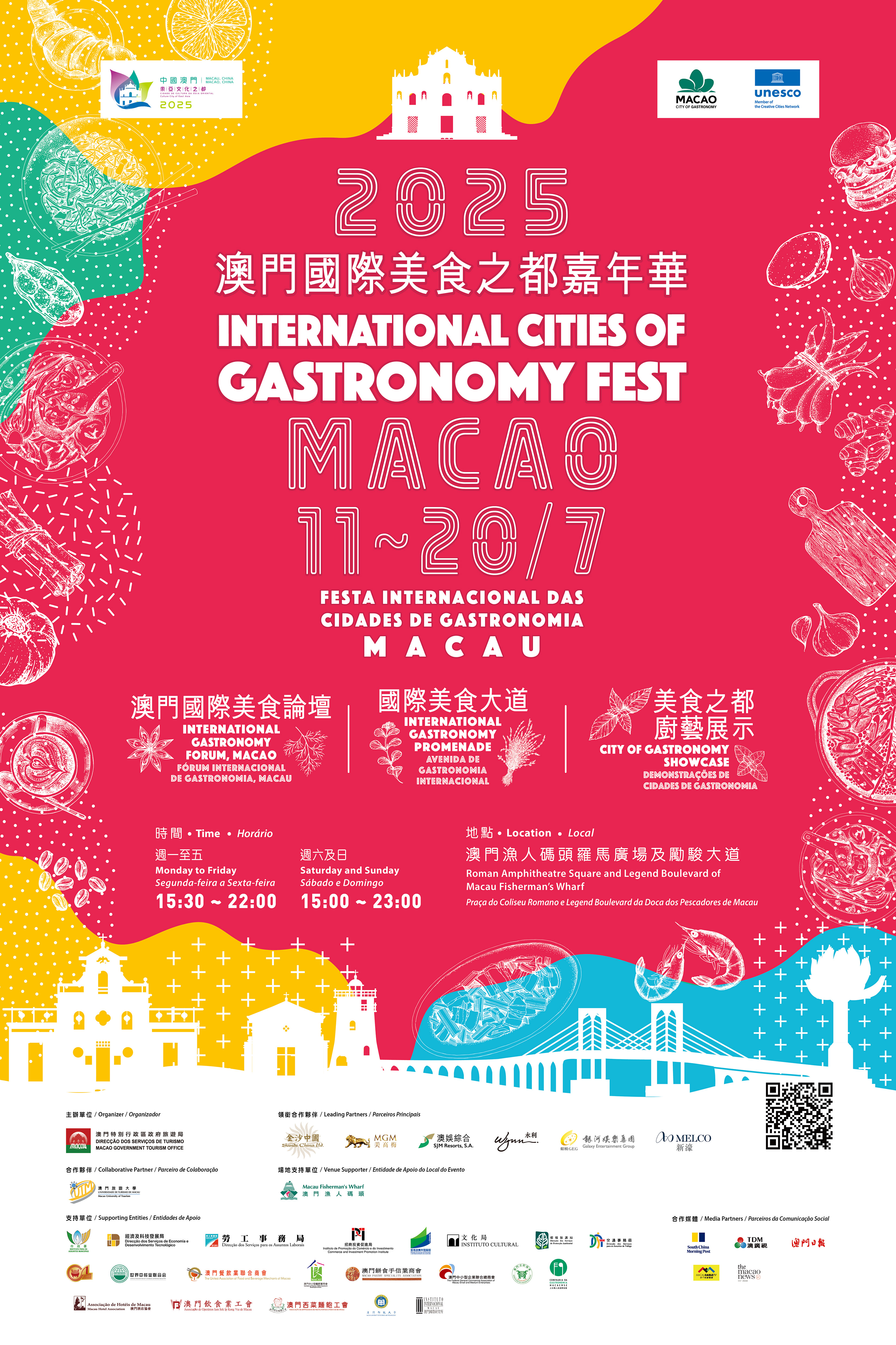 A “Festa Internacional das Cidades de Gastronomia, Macau 2025”, organizada pela Direcção dos Serviços de Turismo (DST), decorrerá entre 11 e 20 de Julho, na Praça do Coliseu Romano e no Legend Boulevard da Doca dos Pescadores de Macau. Este ano sob o tema “Especiarias e Ervas Aromáticas”, o evento reunirá 34 Cidades Criativas de Gastronomia oriundas de 21 países distribuídos por seis continentes. Durante dez dias, os participantes darão vida aos três destaques do evento que apresentarão gastronomia internacional, demonstrações culinárias e fórum de gastronomia. A festa de sabores de diferentes culturas gastronómicas integrará turismo com gastronomia, cultura, transmissão e inovação, numa exibição ao mundo da singularidade de Macau como Cidade Criativa de Gastronomia e vantagens como plataforma.
