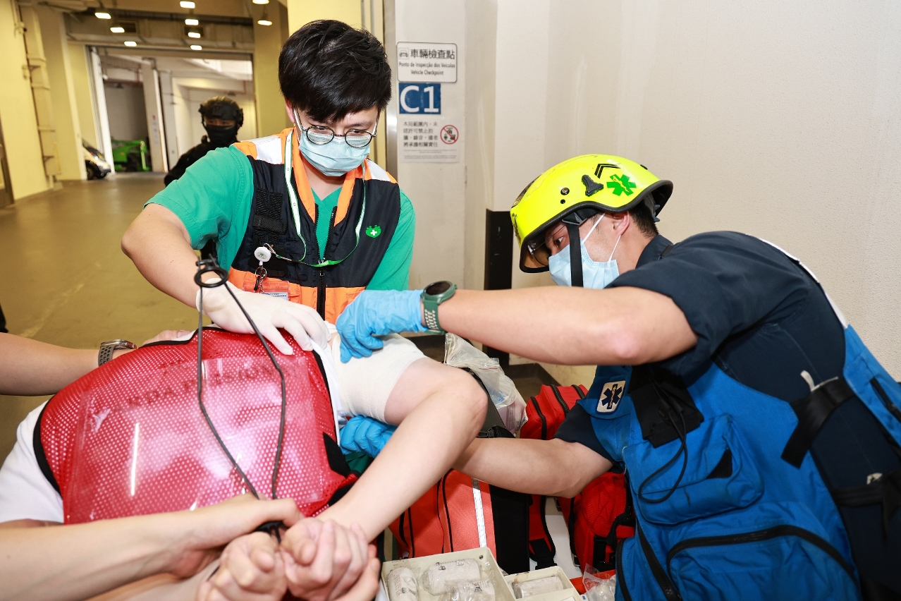 • Os paramédicos do CB e o pessoal médico dos SS simularam o tratamento médico para os feridos