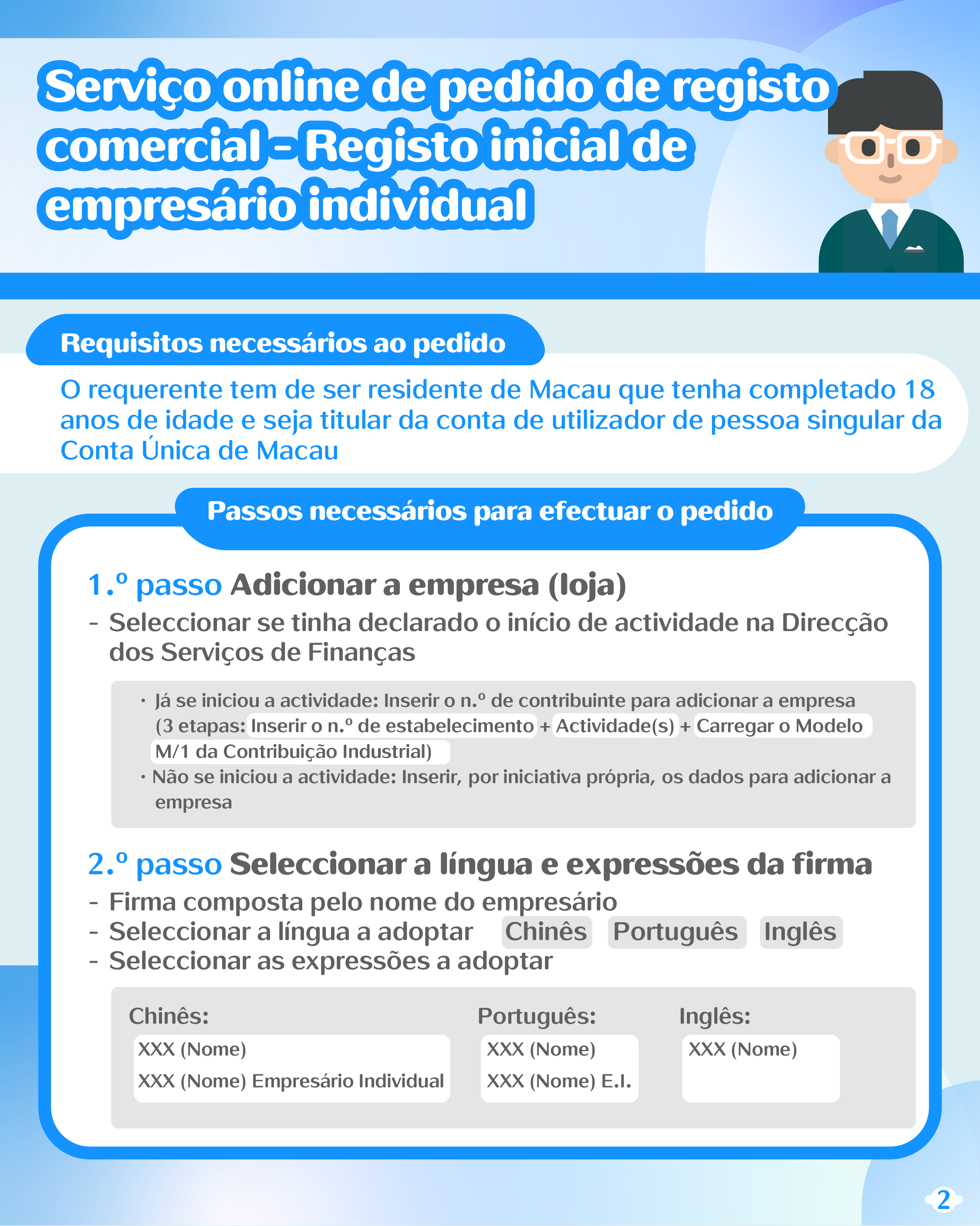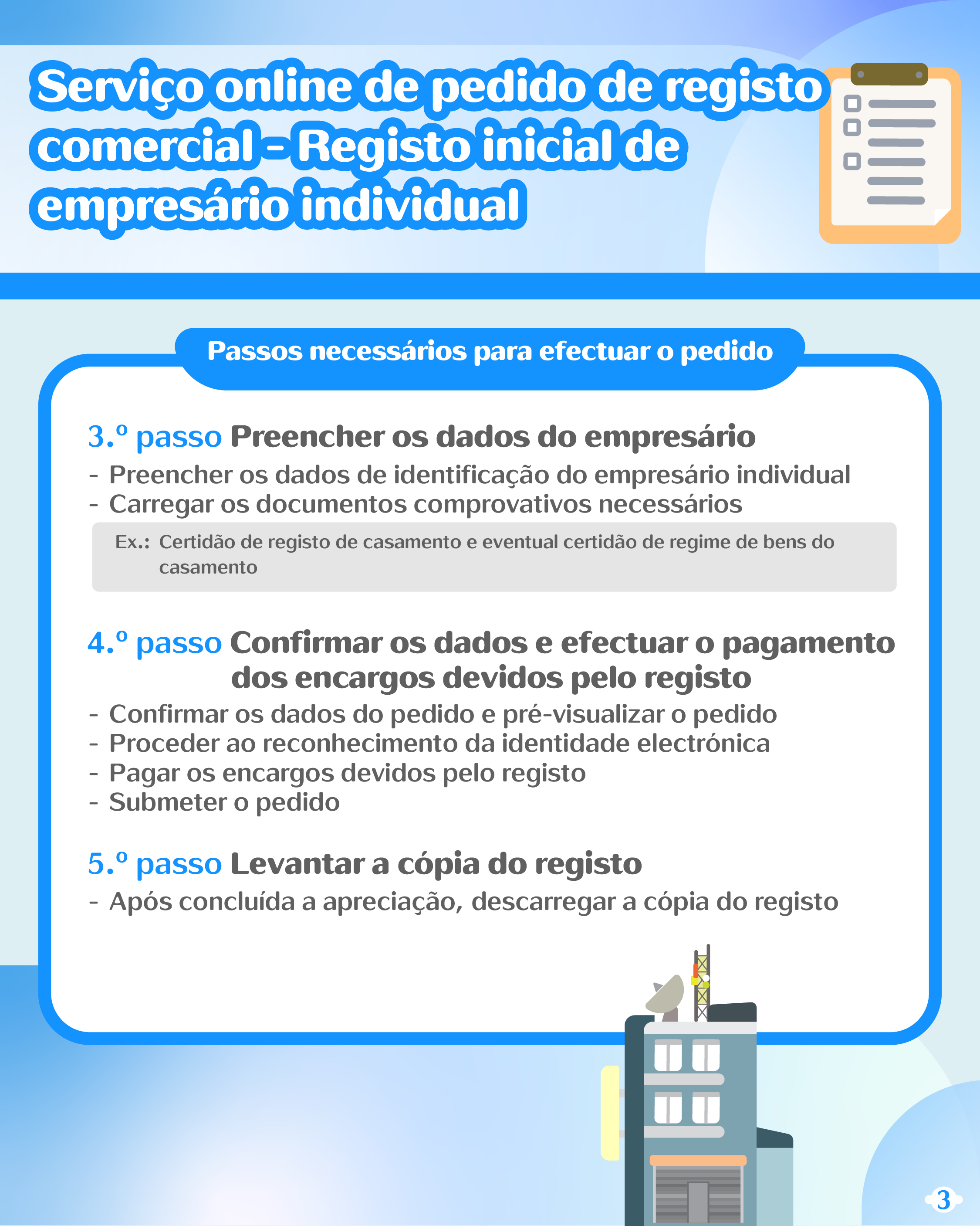 Relativamente ao registo comercial, são lançados novos serviços totalmente electrónicos do registo inicial de empresário comercial, pessoa singular, da alteração do domicílio (endereço) de empresário comercial, pessoa singular e do cancelamento do registo de empresário comercial, pessoa singular. Para tal, os cidadãos podem apresentar os pedidos através da Plataforma para Empresas e Associações, contribuindo assim para a concretização do novo modelo do tratamento de assuntos por via online. Depois de ter apresentado as informações e pago os encargos devidos pelo registo por via online, a conservatória receberá imediatamente o respectivo pedido, podendo assim o requerente levantar a cópia do registo por via electrónica após concluída a apreciação do pedido por parte da mesma.