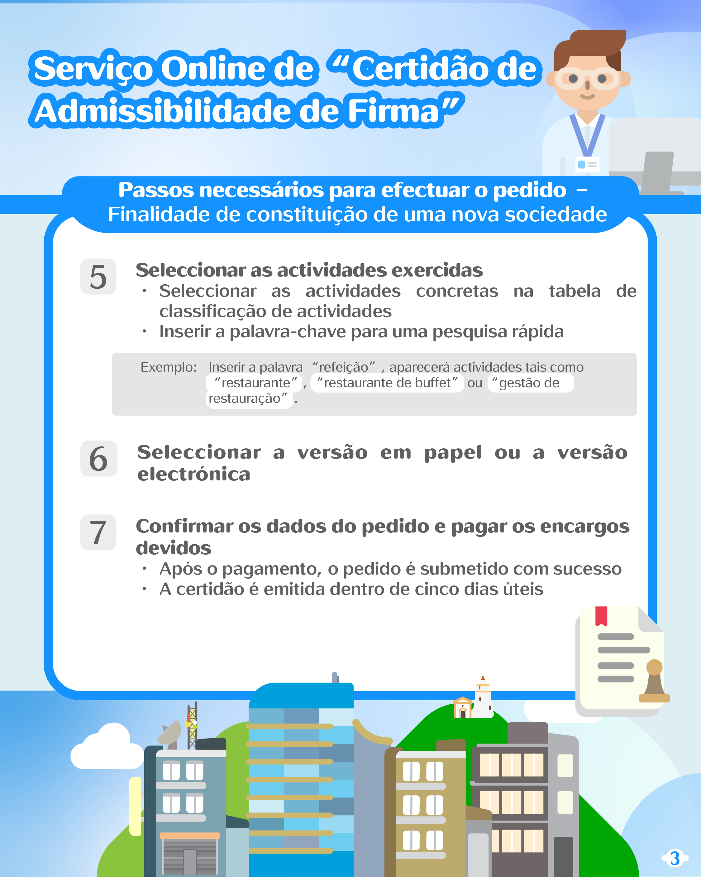 No que diz respeito à certidão de admissibilidade de firma, os cidadãos podem pedi-la através da Conta Única de Macau ou da Plataforma para Empresas e Associações, recebendo online a versão electrónica ou levantando presencialmente a versão em papel. Assim sendo, antes da constituição de sociedade ou da alteração da firma ou objecto da sociedade, os cidadãos não necessitam de se dirigir à conservatória para solicitar e levantar a certidão de admissibilidade de firma, tendo o objectivo de confirmar se a firma (denominação social) a adoptar é admissível, ao contrário do que sucedia no passado.