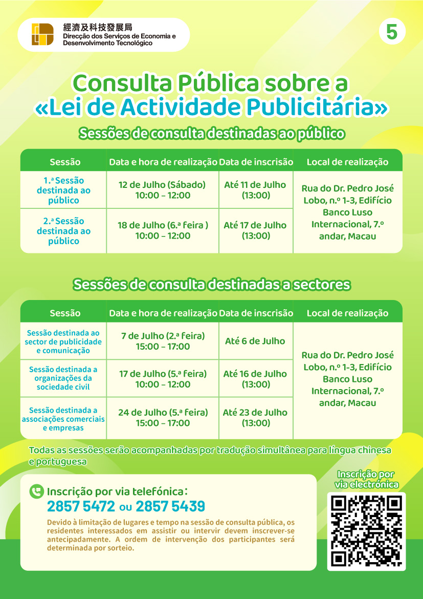 O documento de consulta sobre a revisão da “Lei de Atividade Publicitária” já está disponível para consulta e carregamento na página web temática: https://www.dsedt.gov.mo/pt_PT/web/public/pg_alapc. Os interessados também podem obter o documento de consulta nos seguintes locais: Direção dos Serviços de Economia e Desenvolvimento Tecnológico, Centro de Informação ao Público, Centro de Serviços da RAEM, Centro de Serviços da RAEM das Ilhas e Centro de Prestação de Serviços ao Público da Zona Central. Durante o período de consulta pública, todas as opiniões e sugestões sobre o conteúdo do documento de consulta são bem-vindas, as quais poderão ser apresentadas através da página web temática, por telefone, correio electrónico, fax, correio ou entrega presencial.