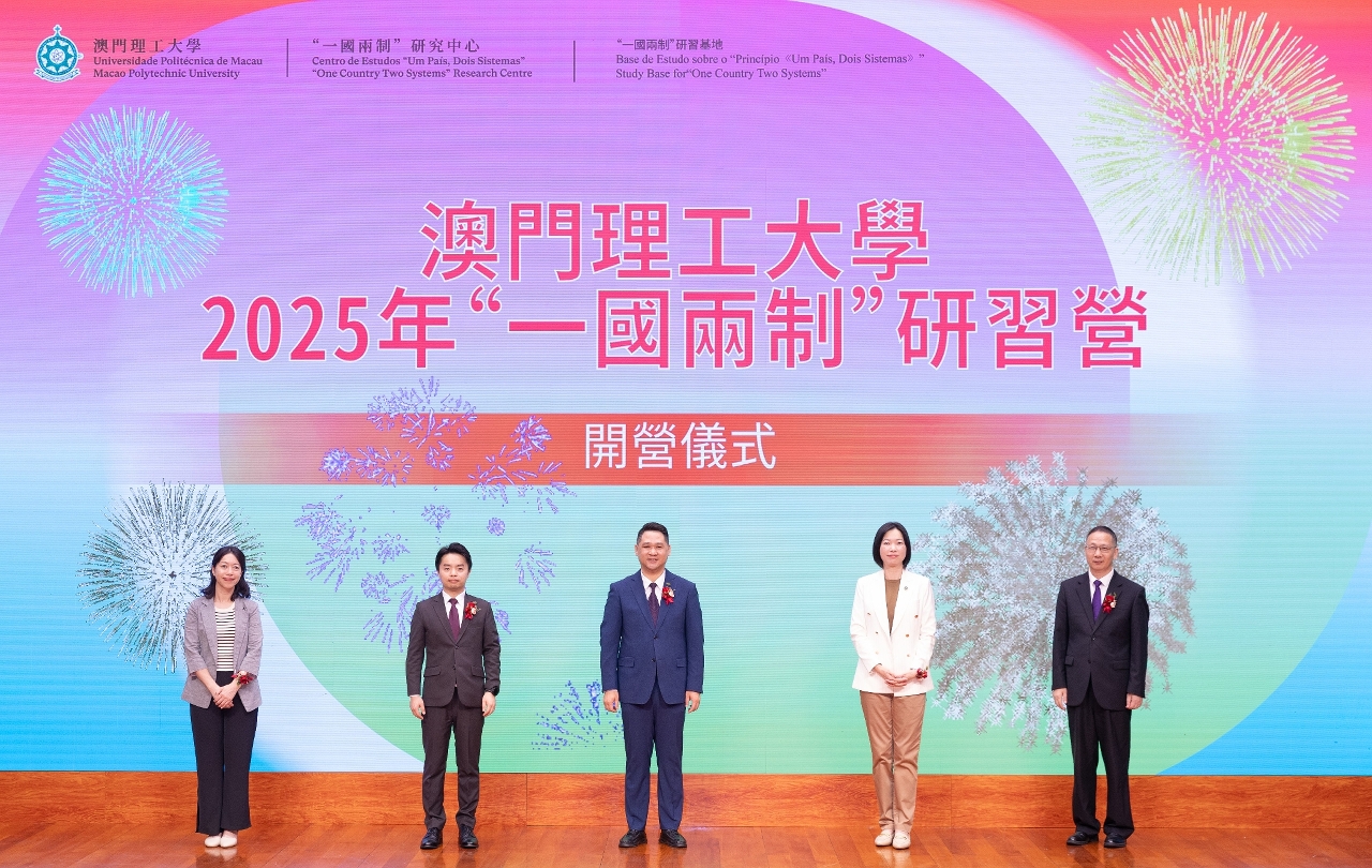 A Cerimónia de Inauguração do Campo de Estudos “Um País, Dois Sistemas” de 2025 da Universidade Politécnica de Macau realizou-se hoje (dia 8 de Julho), pelas 09h30, no Auditório da UPM. A Cerimónia foi presidida pelo Sub-chefe do Departamento de Educação e Assuntos de Juventude do Gabinete de Ligação do Governo Popular Central na RAEM, Shi Shucheng, pelo Subdirector da Direcção dos Serviços de Educação e de Desenvolvimento da Juventude do Governo da RAEM, Teng Sio Hong, pela Reitora Substituta da UPM, Vivian Lei, pela Secretária-Geral Substituta da UPM, Carmen Mok, e pelo Coordenador do Centro de Estudos “Um País, Dois Sistemas”, Leng Tiexun.