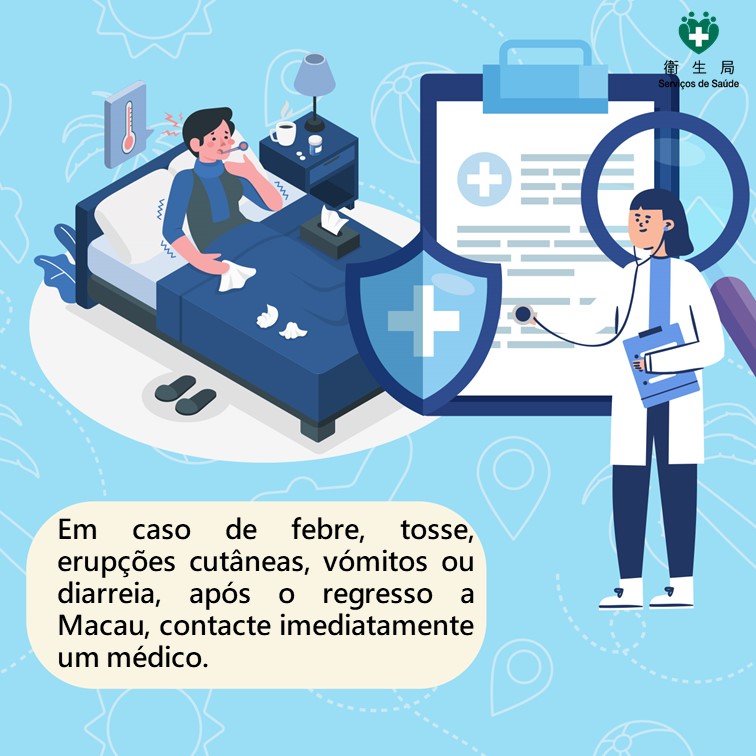 Em caso de apresentar sintomas, tais como febre, calafrios, erupção cutânea, tosse, diarreia ou vómitos, durante a viagem ou após o regresso a Macau, deve recorrer de imediato ao médico, e informá-lo da história recente das viagens ao exterior para diagnóstico e tratamento correctos.