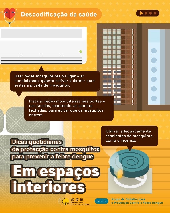 Tendo em conta o aumento significativo das doenças transmitidas por mosquitos nas regiões vizinhas e o elevado risco de transmissão em Macau devido à frequente circulação de pessoas em Macau, com o 1.º caso local da febre de dengue em Macau registado no dia 5 de Julho e o 1.º caso importado da febre chikungunya em Macau registado no dia 18 de Julho, os Serviços de Saúde apelam mais uma vez ao público para se prevenir contra a febre de dengue e a febre chikunjaya, entre outras doenças transmissíveis que podem ser transmitidas por mosquitos, e em caso de apresentar sintomas suspeitos, deve recorrer de imediato ao médico, com vista a assegurar a saúde dos residentes.
