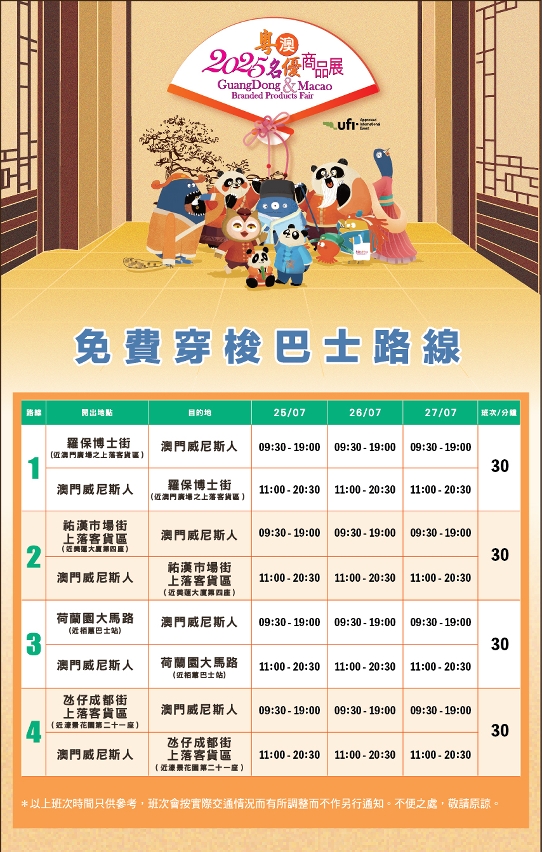 A 2025GMBPF estará aberta das 11h00 às 18h30 horas no dia 24 de Julho (Dia dos Visitantes Profissionais), e das 10h00 às 20h00 horas nos dias 25 e 27 de Julho (Dias de Abertura ao Público, com entrada gratuita). A entidade organizadora disponibilizará ainda várias carreiras de autocarros gratuitos ao recinto do evento. A Feira de Produtos de Marca da Província de Guangdong e Macau 2025 está aberta a todos, para, juntos, criar oportunidades de negócio e partilhar momentos fantásticos!