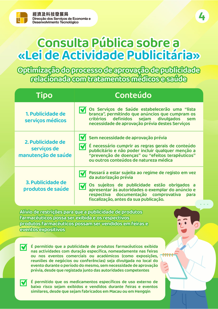 A DSEDT referiu que, como a actual “Lei de Actividade Publicitária” entrou em vigor há vários anos, e na sequência do desenvolvimento contínuo das actividades económicas, os conteúdos, as formas de divulgação e os meios utilizados na publicidade actual são significativamente diferentes dos do passado. O Governo da RAEM pretende através da presente consulta pública, auscultar amplamente as opiniões e sugestões de todos os sectores da sociedade, a fim de melhorar o diploma legal em causa e promover o desenvolvimento do sector de publicidade e da economia de Macau.