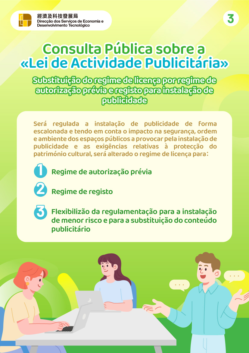 A Direcção dos Serviços de Economia e Desenvolvimento Tecnológico (DSEDT) realizou sessão de consulta destinada às associações comerciais e empresas (dia 24 de Julho), e a última sessão de consulta destinada ao público (dia 26 de Julho), ambas sobre a revisão da “Lei de Actividade Publicitária”, para auscultar as opiniões das associações comerciais, empresas e público sobre a revisão da lei.
