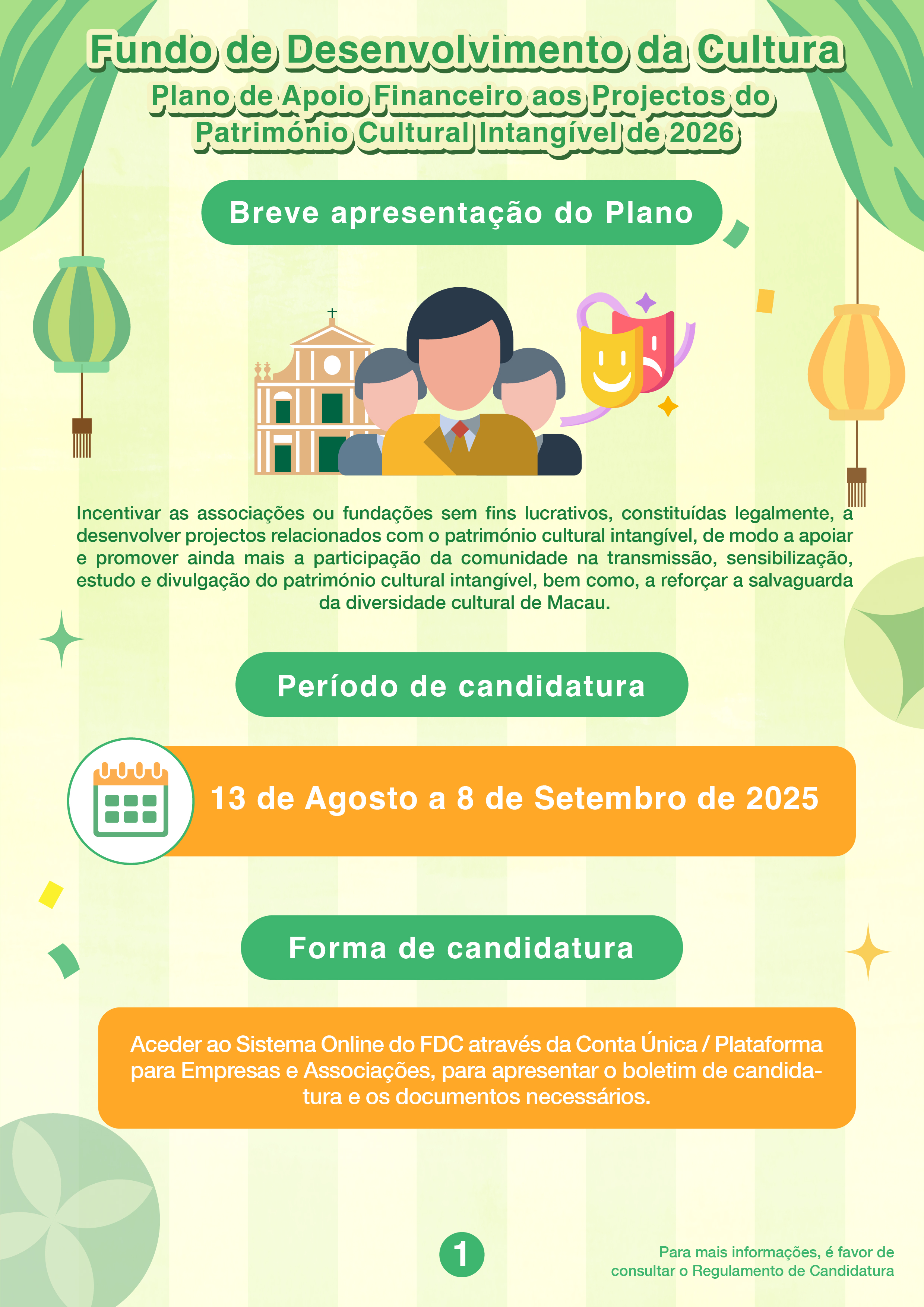 O “Plano de Apoio Financeiro aos Projectos do Património Cultural Intangível de 2026” visa incentivar as entidades que se dedicam à salvaguarda do património cultural intangível, associações ou fundações locais a apresentarem projectos candidatos, no intuito de promover a participação da comunidade na transmissão, sensibilização, estudo e divulgação do património cultural intangível. O âmbito de apoio financeiro é limitado aos projectos já incluídos na Lista e no Inventário do Património Cultural Intangível de Macau, incluindo candidaturas cujo conteúdo seja inteiramente constituído por destaque de ópera cantonense, podendo outros projectos relacionados de arte musical candidatar-se ao “Plano de Apoio Financeiro para Actividades/Projectos Culturais”. A modalidade do apoio financeiro deste Plano é por subsídios, com o período de apoio financeiro de um ano.