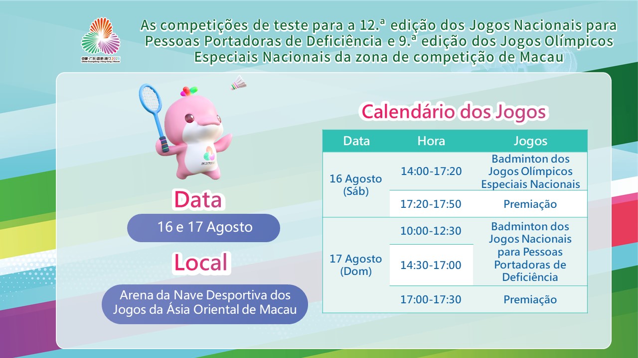 As competições de teste das modalidades de badminton dos Jogos Nacionais para Pessoas Portadoras de Deficiência e dos Jogos Olímpicos Especiais Nacionais serão igualmente realizadas na Arena da Nave Desportiva dos Jogos da Ásia Oriental de Macau. No dia 16 de Agosto, às 14:00 horas, serão realizadas as competições de teste de badminton dos Jogos Olímpicos Especiais Nacionais. As competições de teste de badminton dos Jogos Nacionais para Pessoas Portadoras de Deficiência terão lugar no dia 17 de Agosto, das 10:00 às 17:30 horas, contando com as equipas convidadas de Guangdong e de Macau para a competição. As competições de teste serão realizados de acordo com as normas e os requisitos das provas, revendo os detalhes dos preparativos para a organização das competições, assegurando os preparativos necessários para os Jogos Olímpicos Especiais para Deficientes a realizar em Dezembro.