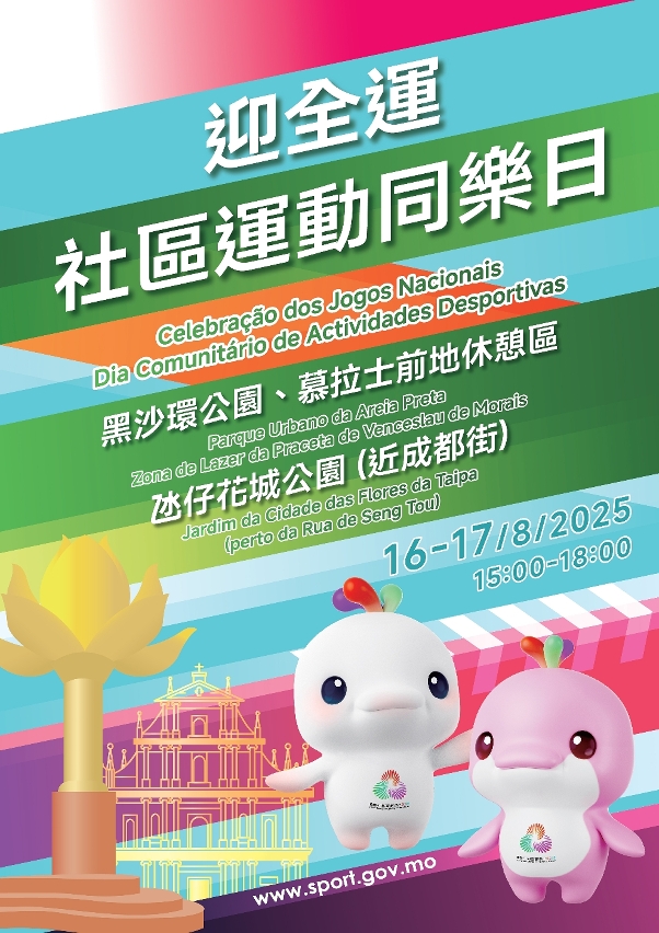 A fim de aprofundar o conhecimento da população sobre as modalidades da Zona de Competição de Macau da 15.ª edição dos Jogos Nacionais, da 12.ª edição dos Jogos Nacionais para Pessoas Portadoras de Deficiência e da 9.ª edição dos Jogos Olímpicos Especiais Nacionais (doravante designadas por “15.ª edição dos Jogos Nacionais e Jogos Olímpicos Especiais para Deficientes”), bem como promover o espírito de participação desportiva de toda a população, foi lançada a iniciativa “Celebração dos Jogos Nacionais x Dia Comunitário de Actividades Desportivas”. As actividades da primeira semana no âmbito desta iniciativa foram realizadas, a 9 e 10 de Agosto, com sucesso e com a adesão activa dos residentes. Para a presente semana, concretamente das 15h00 às 18h00 dos dias 16 e 17 de Agosto, está também programada uma série de actividades, a realizar em simultâneo nos três seguintes locais: Parque Urbano da Areia Preta, Zona de Lazer da Praceta de Venceslau de Morais e Jardim da Cidade das Flores da Taipa (perto da Rua de Seng Tou).