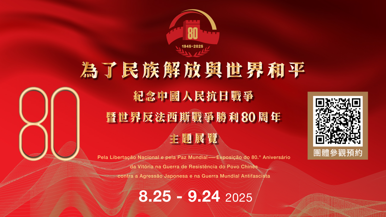 Com o propósito de recordar o feito histórico, homenagear os mártires e exaltar os nobres espíritos patrióticos, a exposição “Pela Libertação Nacional e pela Paz Mundial - Exposição do 80.º Aniversário da Vitória na Guerra de Resistência do Povo Chinês contra a Agressão Japonesa e na Guerra Mundial Antifascista”, organizada pelo Governo da Região Administrativa Especial de Macau, com o apoio do Museu Comemorativo da Guerra de Resistência do Povo Chinês contra a Agressão Japonesa, decorrerá de 25 de Agosto a 24 de Setembro, no Complexo da Plataforma de Serviços para a Cooperação Comercial entre a China e os Países de Língua Portuguesa, sendo bem-vindos a visita dos residentes. Os grupos podem inscrever-se e marcar serviços de visita guiada a partir de 18 de Agosto através da página electrónica temática. Além disso, o Instituto Cultural (IC) e a Direcção dos Serviços de Educação e de Desenvolvimento da Juventude irão organizar conjuntamente um simpósio temático no dia 20 de Setembro, no Pequeno Auditório do Centro Cultural de Macau, em que serão convidados especialistas e académicos do Interior da China e de Macau para abordarem em profundidade o significado histórico da vitória na guerra de resistência, cujas inscrições estarão abertas a partir de 16 de Agosto.