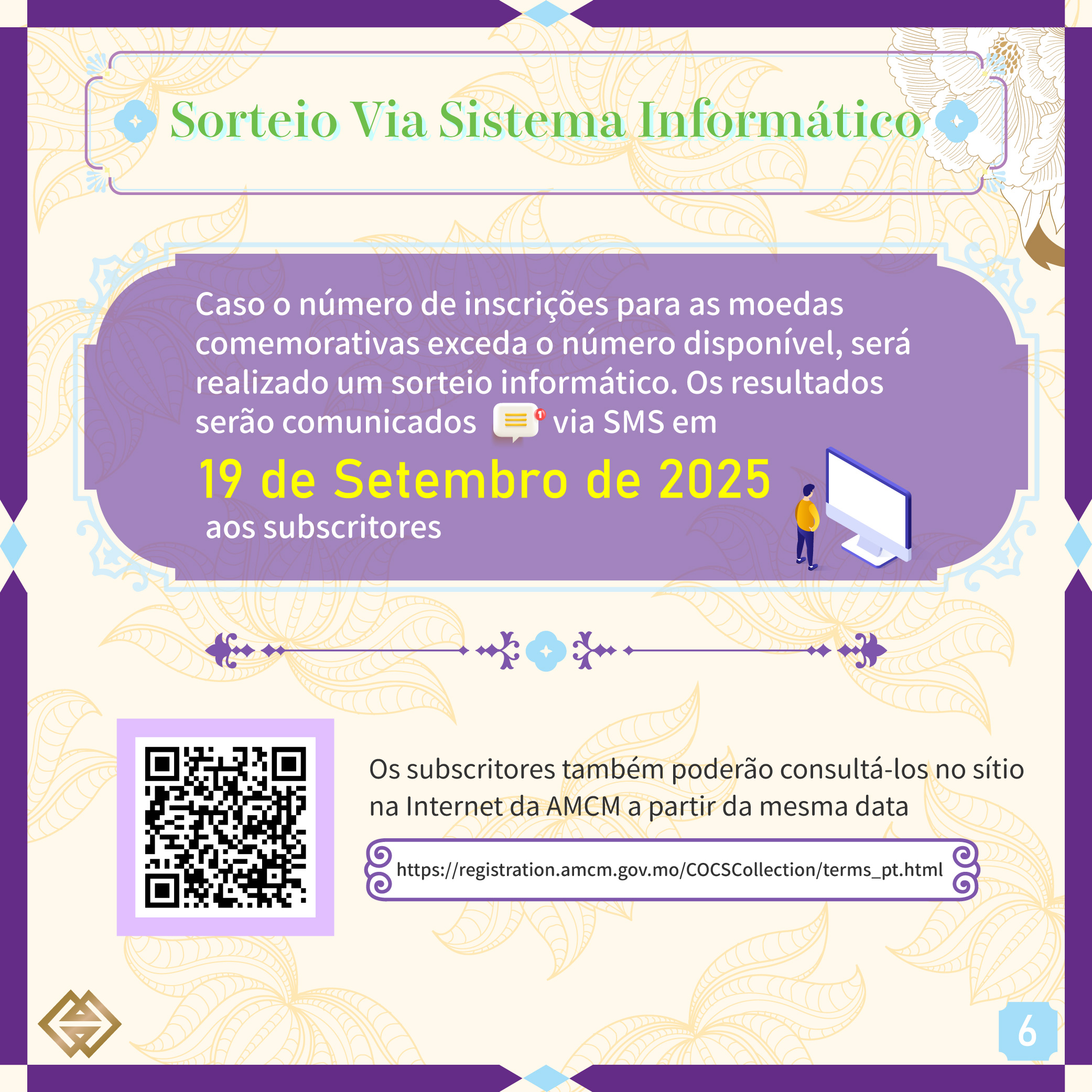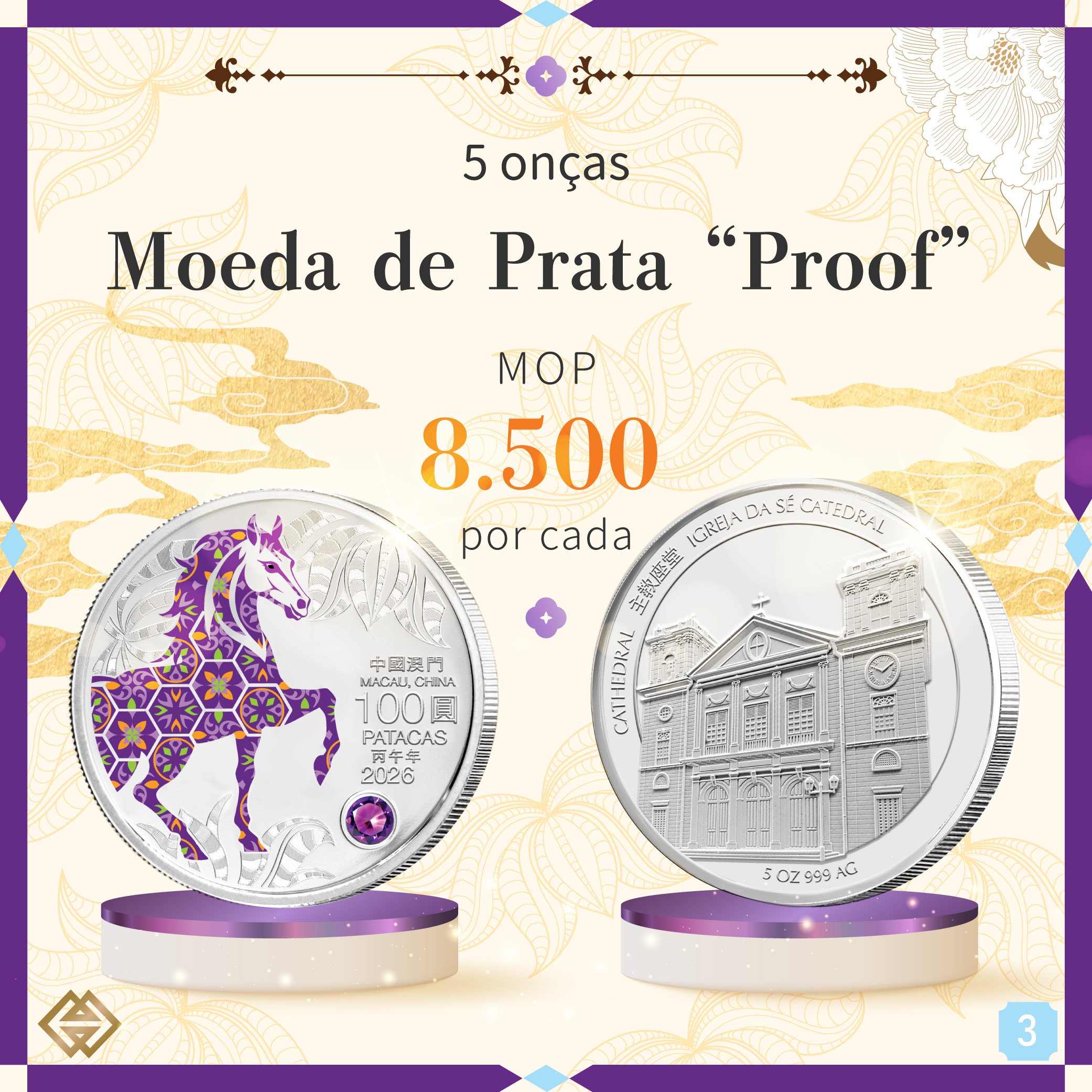 As moedas comemorativas do Ano Lunar do Cavalo são constituídas por uma moeda de prata “proof” de 1 onça, uma moeda de prata “proof” de 5 onças e uma moeda de ouro “proof” de 0,5 onça. Nas situações de excesso de subscrições, a atribuição será realizada mediante sorteio, via sistema informático. Os resultados do sorteio serão comunicados por SMS, em 19 de Setembro de 2025. Após a subscrição, os subscritores podem consultar os resultados do sorteio, no Sistema do serviço de subscrição “on-line” das moedas comemorativas da AMCM(https://registration.amcm.gov.mo/COCSCollection/terms_pt.html), a partir desse dia.