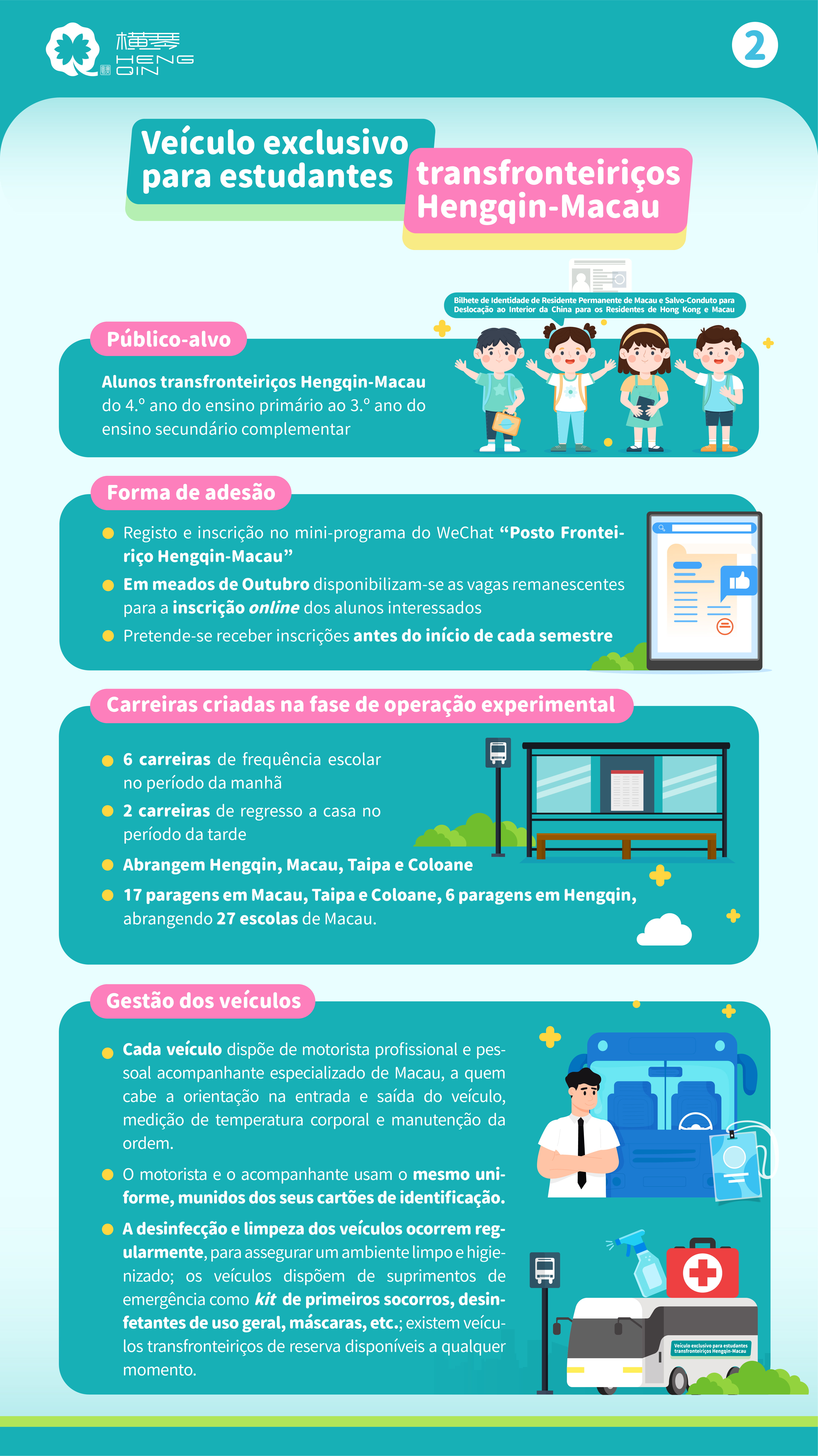 Na fase de operação experimental, o serviço de Veículo exclusivo para estudantes transfronteiriços Hengqin-Macau destina-se aos alunos transfronteiriços Hengqin-Macau que frequentam do 4.º ano do ensino primário ao 3.º ano do ensino secundário complementar, sejam residentes permanentes de Macau, de nacionalidade chinesa e titulares do Salvo-Conduto para Deslocação ao Interior da China dos Residentes de Hong Kong e Macau. O serviço funciona, a título experimental, durante o semestre de Outono do ano lectivo 2025/2026, com a disponibilização de 6 carreiras de frequência escolar no período da manhã e 2 carreiras de regresso a casa no período da tarde. Foram criadas para o efeito 17 paragens na Península de Macau, Taipa e Coloane, e 6 paragens na Zona de Cooperação, abrangendo 27 escolas de Macau. A inscrição pode ser efectuada no mini-programa do WeChat “Posto Fronteiriço Hengqin-Macau”, estando, entretando, já inscritos, na primeira ronda, 65 alunos. Em meados de Outubro disponibilizam-se as vagas remanescentes para as inscrições dos alunos interessados e pretende-se receber as inscrições antes do início de cada semestre.