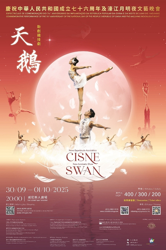 A fim de celebrar com o público o Festival da Lua e o Dia Nacional da China, o “Espectáculo de Comemoração do 76.º Aniversário da Implantação da República Popular da China e da Noite de Luar de Haojiang - Novo Espetáculo Acrobático Cisne” será realizado nos dias 30 de Setembro e 1 de Outubro de 2025, pelas 20h00, no The Venetian Theatre. Os bilhetes estarão disponíveis para venda ao público a partir de 4 de Setembro.