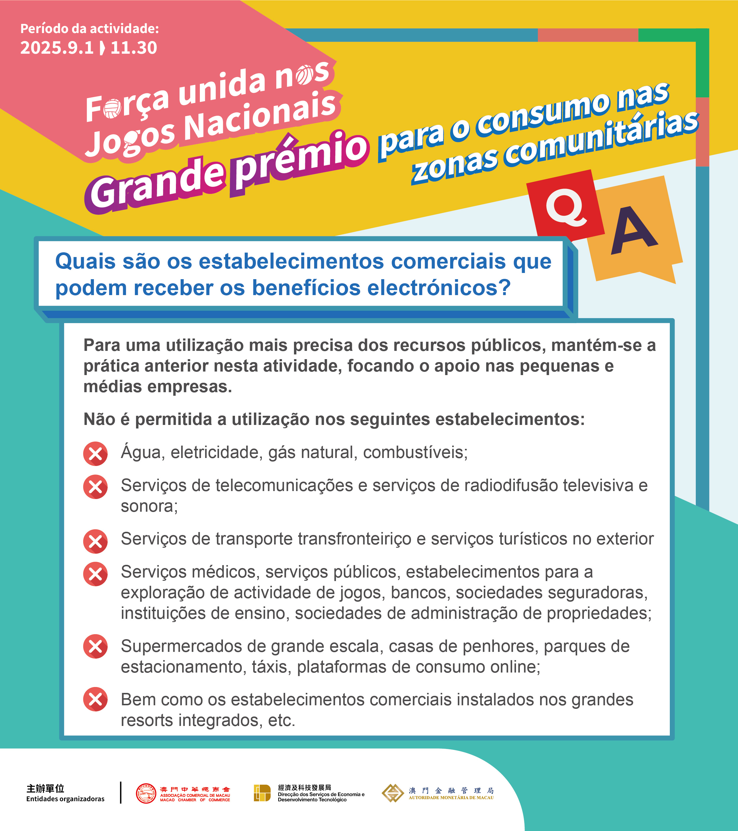 Para facilitar a identificação das lojas aderentes por parte dos consumidores, as entidades organizadoras procederão progressivamente à afixação de cartazes e à distribuição de cartazes de mesa para a campanha em mais de 20 mil lojas elegíveis em Macau para utilizar os benefícios. Para apoiar as lojas nas zonas comunitárias, de forma precisa e eficaz, reforçando a promoção do consumo dos residentes nos bairros comunitários, o âmbito de aplicação dos benefícios de consumo não abrange os seguintes: água; eletricidade; gás natural; combustíveis; serviços de telecomunicações e audiovisuais; serviços de transporte transfronteiriço, serviços turísticos no exterior; serviços médicos; estabelecimentos para a exploração de actividade de jogos; bancos e sociedades seguradoras e outras instituições financeiras; casas de penhores; supermercados de grande escala; sociedades de administração de propriedades; instituições de ensino; parques de estacionamento; táxis; parquímetros; máquinas de venda automática; estabelecimentos comerciais que instalam nas instalações das grandes empresas de turismo e lazer integrado.