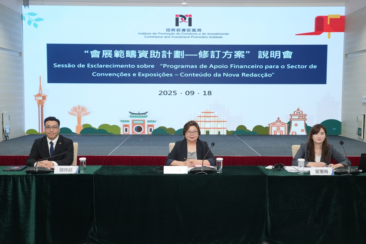 Para elevar a competitividade internacional e a vitalidade da indústria de convenções e exposições de Macau, impulsionando a sua internacionalização, profissionalização, digitalização e ecologização, o Instituto de Promoção do Comércio e do Investimento (adiante designado por “IPIM”) procedeu à revisão do “Programa de Estímulo às Convenções e Exposições” e do “Programa de Incentivo Financeiro para Participação em Feiras e Exposições”. Hoje (dia 18) realizou-se uma sessão de esclarecimento para apresentar o conteúdo de optimizações realizadas.