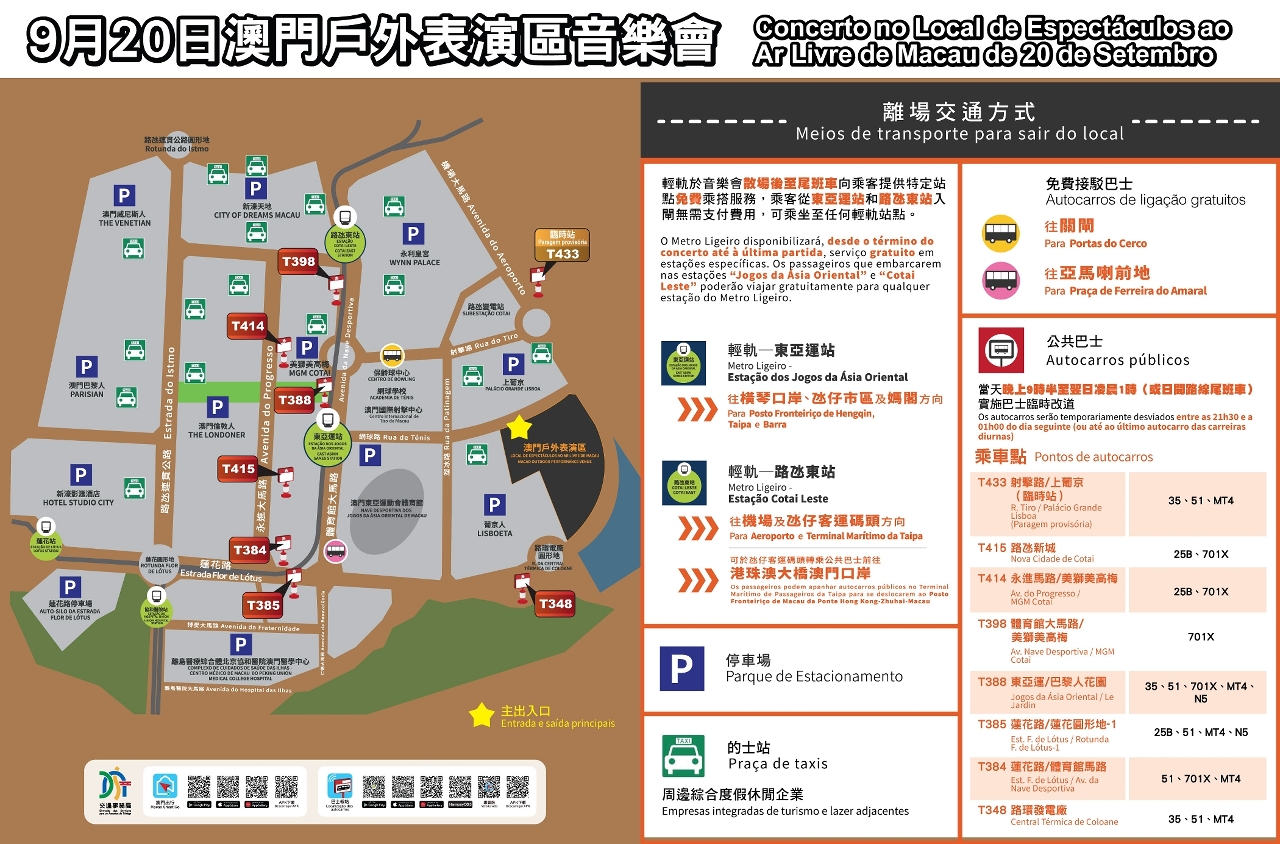 O Local de Espectáculos ao Ar Livre de Macau irá realizar um espectáculo na noite de 20 de Setembro, com entrada a partir das 16h00 e término por volta das 22h30. Em articulação com a organização do espectáculo e a deslocação do público ao local, serão implementadas medidas provisórias de trânsito nas vias circundantes do local de espectáculos, com ajustes temporários às carreiras de autocarros, disponibilização de serviço gratuito do Metro Ligeiro em horários e estações específicos e reforço oportuno da sua frequência, criação de linhas gratuitas de autocarro de ligação e estabelecimento de zonas pedonais provisórias, para escoar o fluxo de pessoas e melhorar a segurança dos peões. A Direcção dos Serviços para os Assuntos de Tráfego (DSAT) recomenda aos espectadores que utilizem, tanto quanto possível, os transportes públicos colectivos para se deslocarem ao local de espectáculos, prestando atenção às informações mais actualizadas sobre o trânsito, as condições meteorológicas e os avisos da entidade organizadora, planeando antecipadamente as suas viagens e seguindo as instruções do pessoal no local.