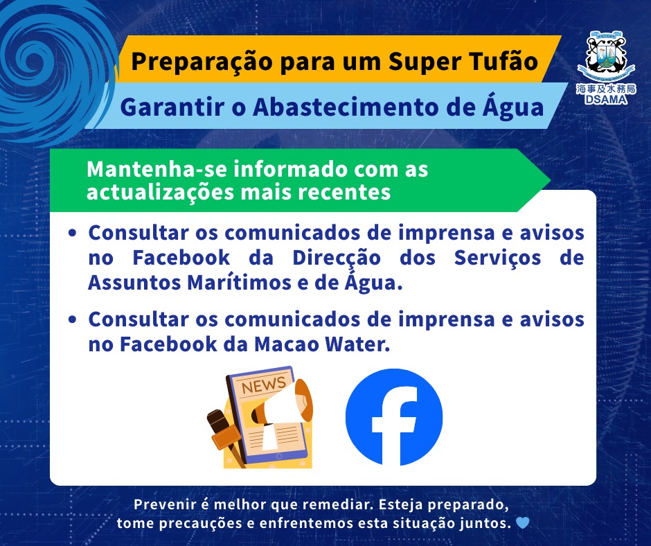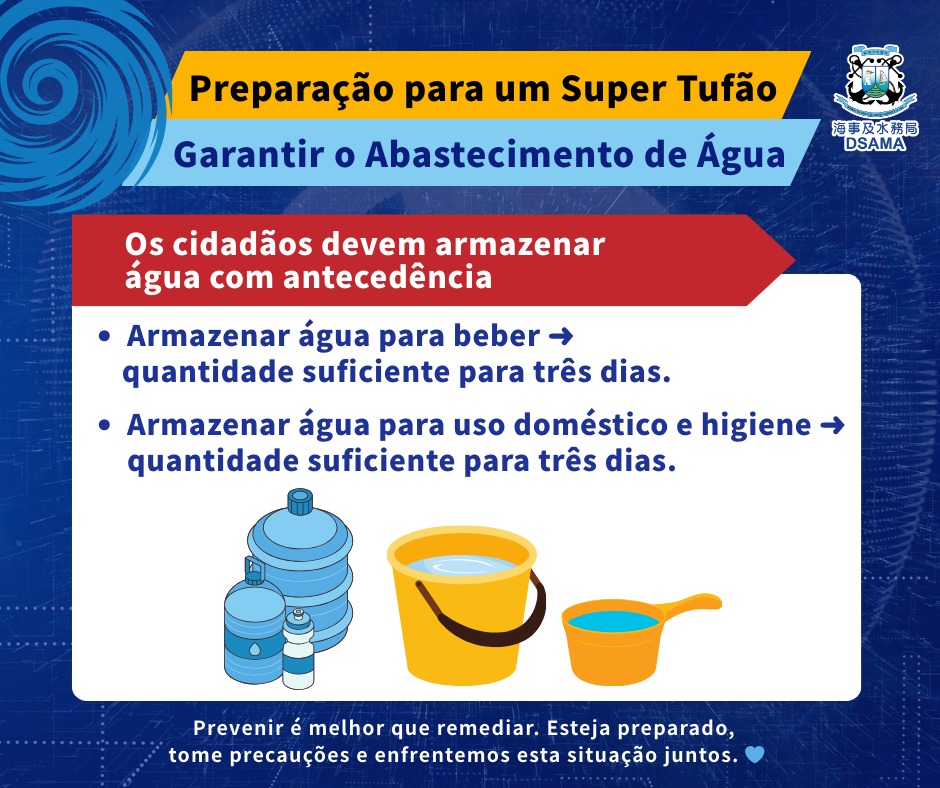 A DSAMA recorda que os cidadãos devem armazenar antecipadamente uma quantidade adequada de água para consumo doméstico, incluindo água potável, apesar das várias medidas de segurança já implementadas nas principais instalações de abastecimento de água. Os proprietários e as empresas de administração de condomínios devem verificar o funcionamento dos sistemas de abastecimento de água nos edifícios e assegurar que o nível da água dos tanques de água nos edifícios altos se mantenha elevado. A DSAMA apela aos cidadãos para que prestem atenção às notícias divulgadas por esta Direcção e pela SAAM, a fim de obterem informações fiáveis e actualizadas sobre o abastecimento de água.