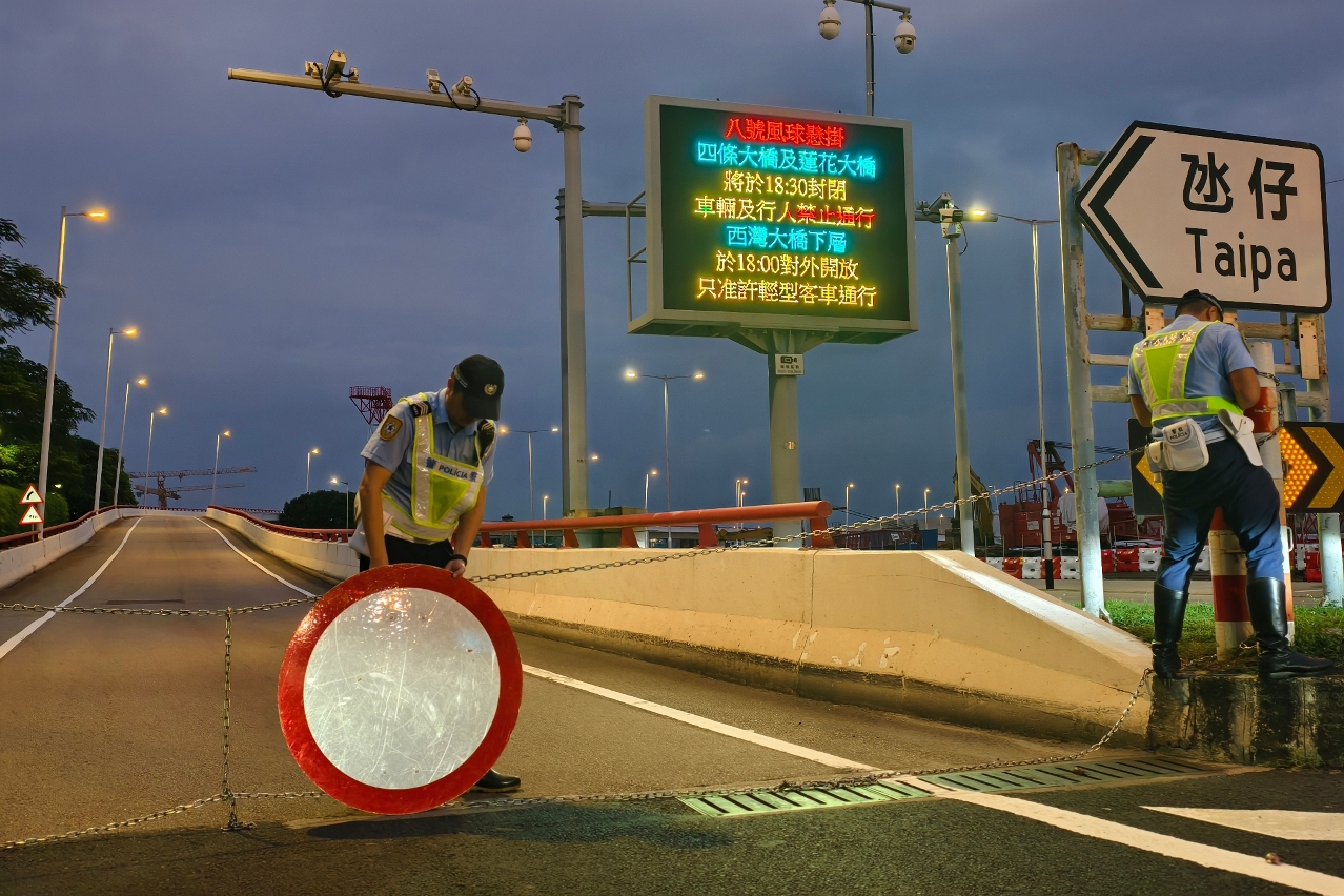 Em relação aos serviços alfandegários, o posto fronteiriço da Ponte HKZM foi suspenso pelas 15h00 do dia 23 de Setembro, e os postos de migração das Portas do Cerco, de Qingmao e do Parque Industrial Transfronteiriço Zhuhai-Macau foram encerrados temporariamente a partir das 19h00 do dia 23 de Setembro. O Posto Fronteiriço Hengqin foi encerrado pelas 19h00, mantendo-se apenas o serviço de passagem de veículos de passageiros. Durante o içamento dos sinais n.º 9 e n.º 10 de tempestade tropical, o serviço de passagem de veículos de passageiros do Posto Fronteiriço de Hengqin foi também suspenso. Com a substituição para os sinais n.º 8 e n.º 3 de tempestade tropical, os serviços alfandegários dos postos fronteiriços terrestres foram retomados gradualmente, os serviços de passagem de veículos e da sala de inspecção de passageiros dos veículos foram retomados a partir das 17h30. Os postos fronteiriços das Portas do Cerco, de Qingmao e do Parque Industrial Transfronteiriço Zhuhai-Macau voltaram a funcionar a partir das 21h00 do dia 24 de Setembro. A Sala de Inspecção do Posto Fronteiriço Hengqin retomou o funcionamento dos serviços alfandegários pelas 23h00 e o posto fronteiriço da Ponte HKZM foi reaberto, tendo os serviços alfandegários restabelecido as operações pelas 00h00 do dia 25 de Setembro.