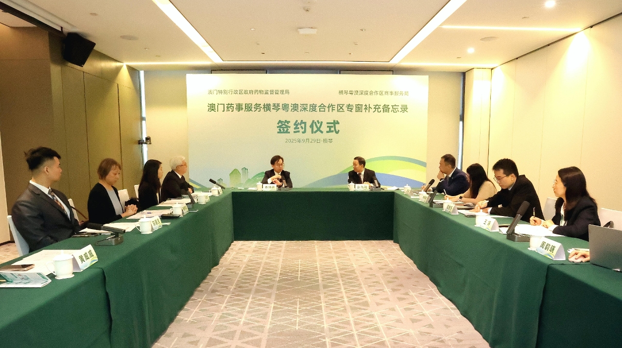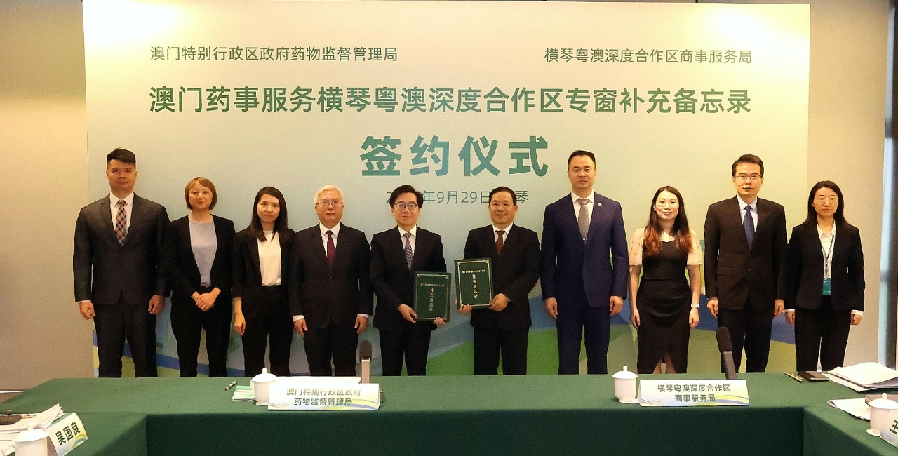 O Instituto para a Supervisão e Administração Farmacêutica (ISAF) e a Direcção dos Serviços de Assuntos Comerciais da Zona de Cooperação Aprofundada entre Guangdong e Macau em Hengqin assinaram, no dia 29 de Setembro de 2025, na Zona de Cooperação, o “Memorando Complementar sobre o Balcão Exclusivo dos Serviços para os Assuntos Farmacêuticos de Macau na Zona de Cooperação Aprofundada entre Guangdong e Macau em Hengqin”, para alargar o âmbito dos destinatários e do conteúdo de serviços do “balcão exclusivo dos serviços para os assuntos farmacêuticos de Macau na Zona de Cooperação Aprofundada entre Guangdong e Macau em Hengqin” (adiante designado por balcão exclusivo). O Presidente do ISAF, Choi Peng Cheong, o Vice-Presidente do ISAF, Ng Kuok Leong, e o Subdirector da Direcção dos Serviços de Assuntos Comerciais da Zona de Cooperação, Peng Jiuru, entre outros dirigentes, participaram na cerimónia de assinatura do memorando.