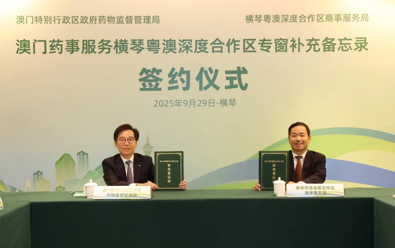 O Instituto para a Supervisão e Administração Farmacêutica (ISAF) e a Direcção dos Serviços de Assuntos Comerciais da Zona de Cooperação Aprofundada entre Guangdong e Macau em Hengqin assinaram, no dia 29 de Setembro de 2025, na Zona de Cooperação, o “Memorando Complementar sobre o Balcão Exclusivo dos Serviços para os Assuntos Farmacêuticos de Macau na Zona de Cooperação Aprofundada entre Guangdong e Macau em Hengqin”, para alargar o âmbito dos destinatários e do conteúdo de serviços do “balcão exclusivo dos serviços para os assuntos farmacêuticos de Macau na Zona de Cooperação Aprofundada entre Guangdong e Macau em Hengqin” (adiante designado por balcão exclusivo). O Presidente do ISAF, Choi Peng Cheong, o Vice-Presidente do ISAF, Ng Kuok Leong, e o Subdirector da Direcção dos Serviços de Assuntos Comerciais da Zona de Cooperação, Peng Jiuru, entre outros dirigentes, participaram na cerimónia de assinatura do memorando.