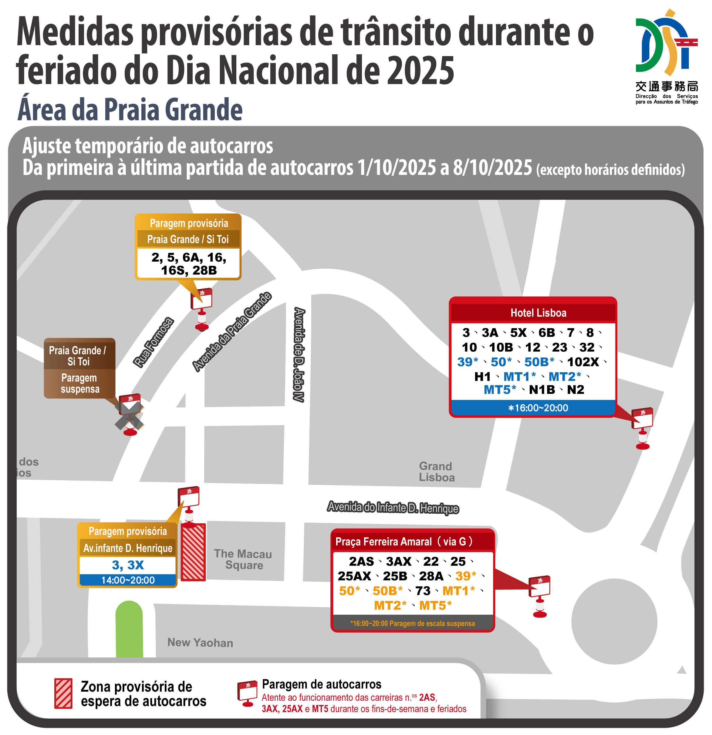 No que respeita ao serviço de autocarros, tendo em conta a experiência dos principais feriados anteriores e a realização de actividades festivas sazonais, a DSAT manterá as medidas temporárias de descongestionamento implementadas anteriormente nas áreas da Praça Leste das Portas do Cerco, Avenida de Almeida Ribeiro, Praia Grande, zonas adjacentes à Rua dos Mercadores, zona do Auto-Silo Pak Kong, e na zona antiga da Taipa. Para além disso, será também utilizada a área do piso térreo do Auto-Silo Pak Kong para a instalação de uma paragem provisória de desvio de autocarros, a qual, de 1 a 8 de Outubro, entre as 16h00 e as 20h00, permitirá desviar as carreiras n.os 1, 3, 3X, 61 e MT4 da paragem “Ponte 16”, optimizando a área de espera e a capacidade de circulação da zona. Por outro lado, a fim de racionalizar a situação da paragem “Praça Ferreira Amaral” e reforçar a capacidade de escoamento das vias circundantes, no mesmo período e horário, de 1 a 8 de Outubro, as carreiras n.os 39, 50, 50B, MT1, MT2 e MT5 deixarão de parar na paragem “Praça Ferreira Amaral” (via G), passando a parar na paragem do “Hotel Lisboa”. Paralelamente, em resposta ao fluxo de passageiros, as duas operadoras de autocarros irão aumentar a frequência das partidas e, durante o período de 1 a 8 de Outubro, irão explorar temporariamente as carreiras sazonais e especiais n.os 3BX, 17T, 21AT, 26AT e 101X carreira especial (101XS), reforçando a capacidade de transporte e acelerando o escoamento de passageiros. As vias rodoviárias circundantes estarão sujeitas a condicionamentos provisórios de trânsito, e os detalhes sobre os ajustamentos provisórios das carreiras de autocarros podem ser consultados nas tabelas em anexo ou nas páginas electrónicas da TCM (www.tcm.com.mo) e da Transmac (www.transmac.com.mo).