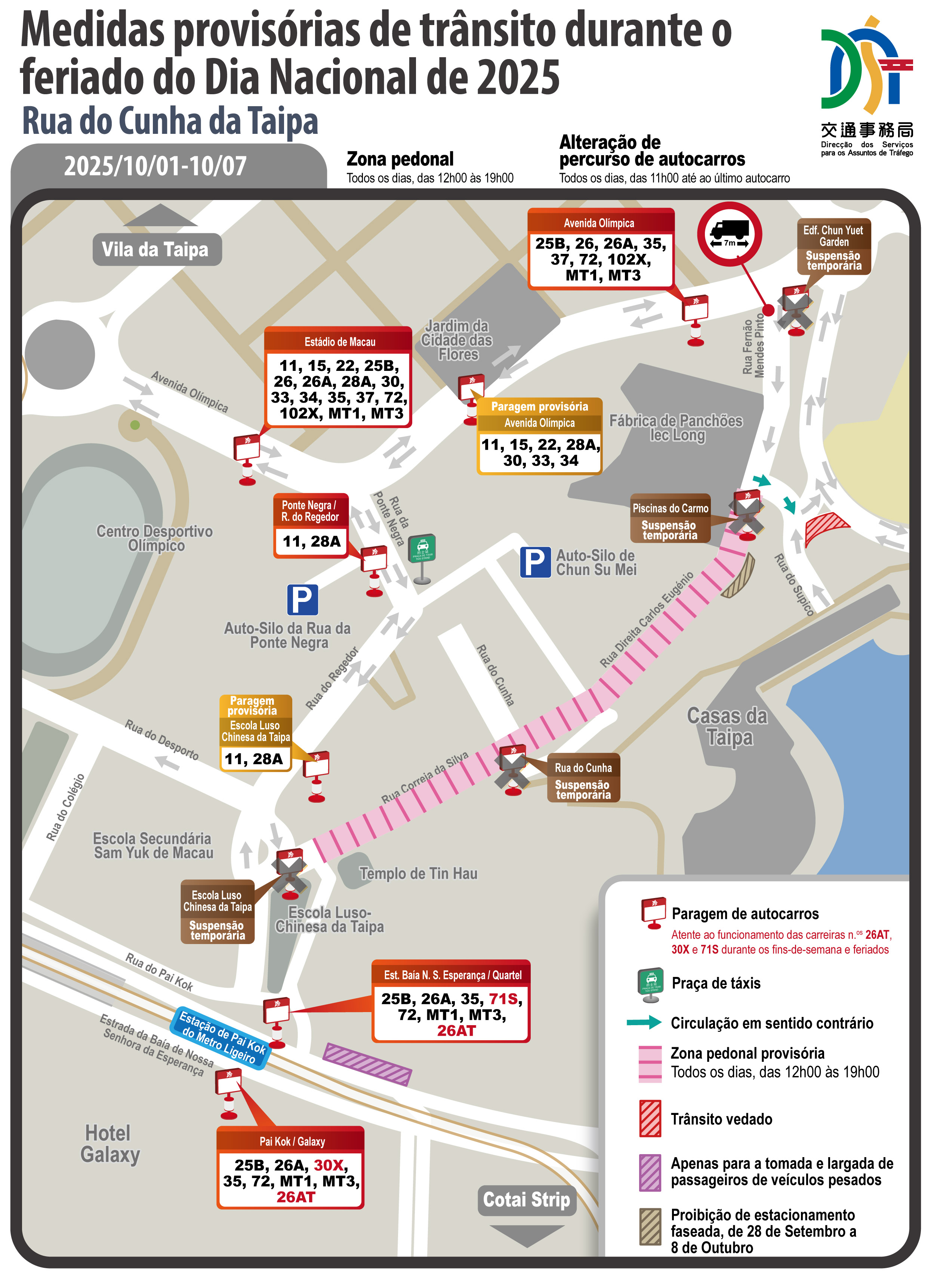 Após coordenação interdepartamental, a DSAT implementará medidas provisórias de trânsito entre os dias 30 de Setembro (terça‑feira) e 8 de Outubro (quarta‑feira), nos postos fronteiriços de Macau e em várias zonas onde se prevê o aumento de fluxo de pessoas e veículos.