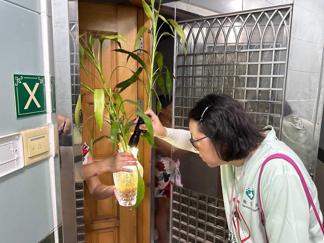 Os Serviços de Saúde salientam que a febre Chikungunya é transmitida através da picada de mosquitos Aedes albopictus infectados pelo vírus Chikungunya, não sendo o vírus transmitido directamente de pessoa para pessoa. A eliminação da fonte de proliferação de mosquitos é a medida preventiva mais eficaz. Durante a inspecção, o pessoal dos Serviços de Saúde prestou apoio aos residentes na verificação dos recipientes com água estagnada no domicílio, tais como jarras, bases de vasos, entre outos, e verificou-se que os recipientes de alguns moradores já se encontram em estado de proliferação, pelo que prestou apoio imediato no tratamento destes recipientes, bem como sensibilizou-os para a prevenção de mosquitos; Além disso, verificou-se a existência de recipientes com água estagnada em algumas áreas públicas, que não estão bem tapados ou colocados de cabeça para baixo, e alguns até já têm proliferação de mosquitos, o que aumenta o risco de propagação da febre Chikungunya, pelo que se deve prestar especial atenção e tomar as medidas preventivas.