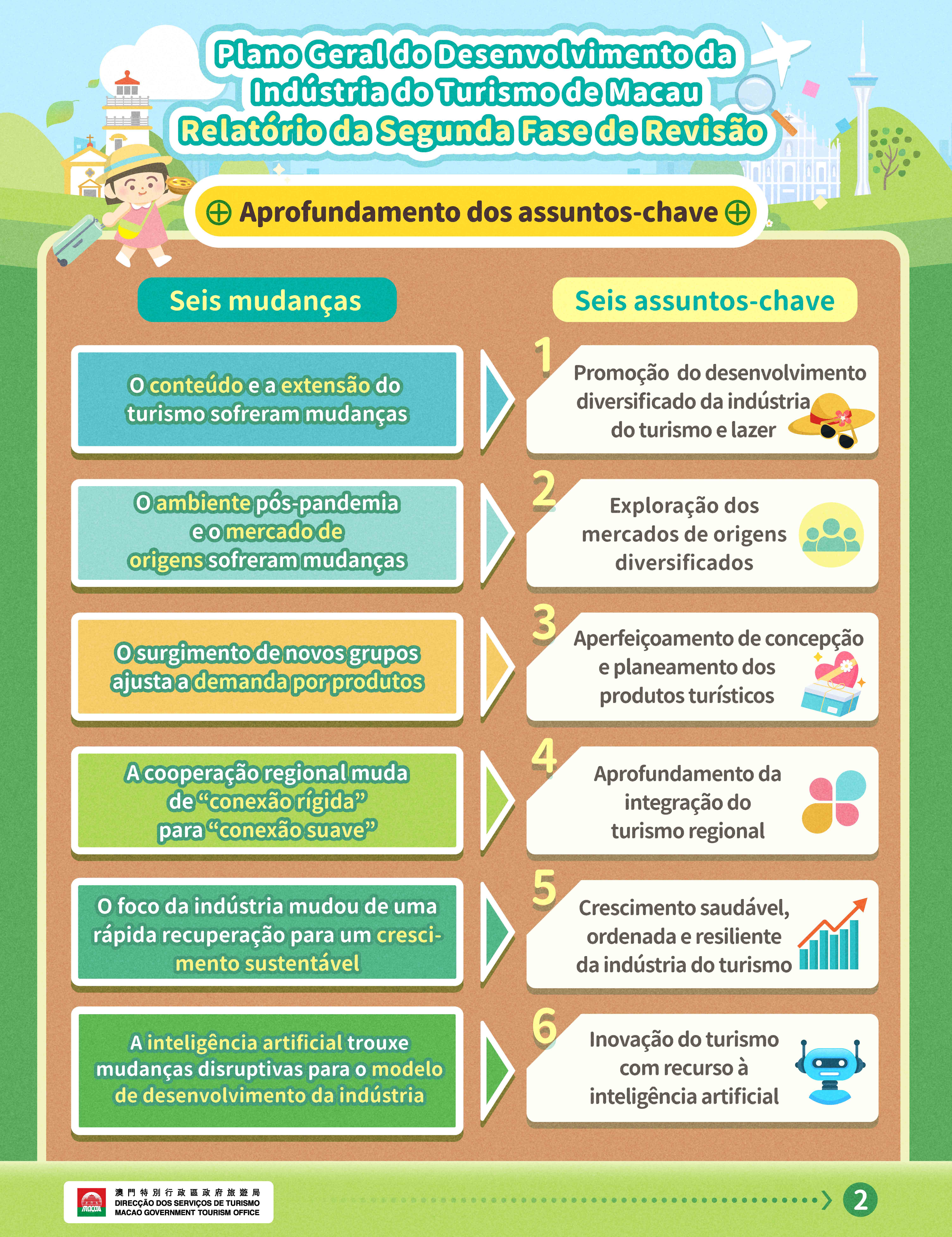 A segunda fase do estudo de revisão do Plano Geral do Desenvolvimento da Indústria do Turismo de Macau incidiu sobre: balanço da implementação entre 2021 e 2024, revisão dos planos de acção e indicadores-chave de 2025 a 2030; análise da situação e tendências de desenvolvimento da indústria turística de Macau. E ainda sobre o aprofundamento de seis assuntos-chave: promoção do desenvolvimento diversificado da indústria do turismo e lazer, exploração de mercados de origens diversificadas, concepção e planeamento de produtos turísticos, aprofundamento da integração do turismo regional, crescimento saudável, ordenado e resiliente da indústria do turismo, e inovação do turismo com recurso à inteligência artificial.