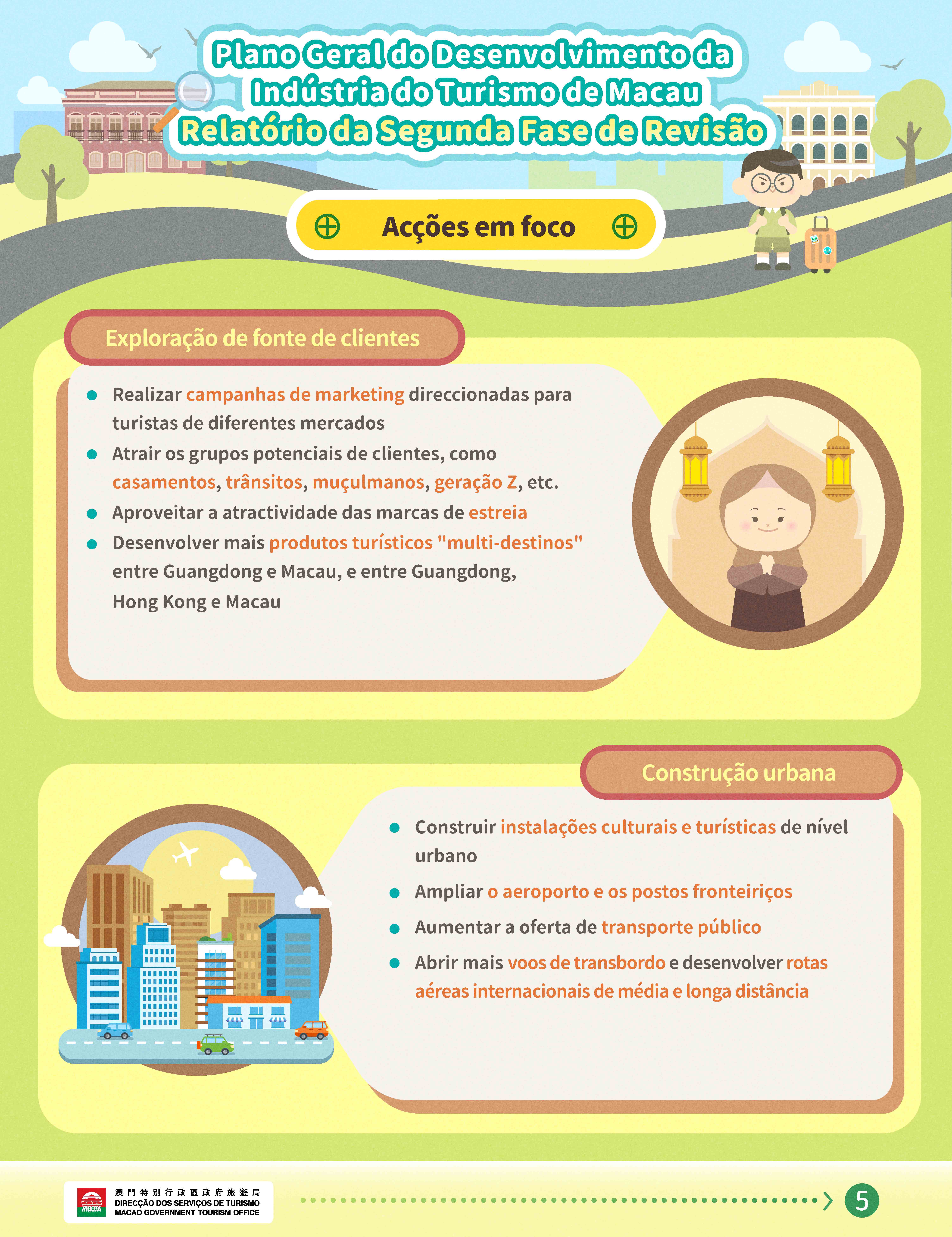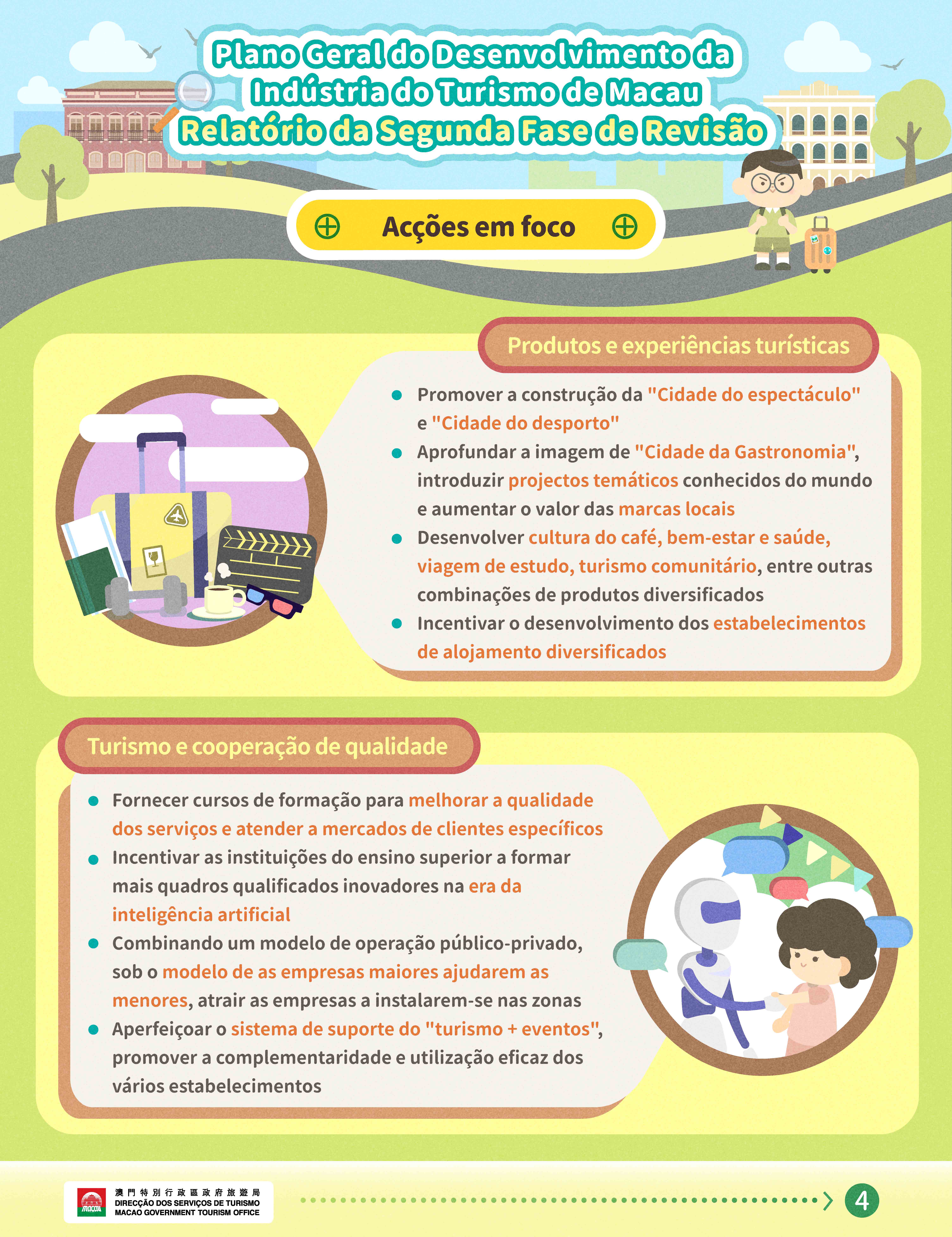Entre as acções em foco inclui-se produtos turísticos agrupando diferentes elementos, atrair projectos conhecidos mundialmente, elevar o valor das marcas locais; fornecer cursos de formação atendendo a mercados de clientes específicos, formar quadros qualificados inovadores na era da inteligência artificial; realizar campanhas de marketing online e presenciais direccionadas, desenvolver produtos turísticos multi-destinos; expandir grupos potenciais de visitantes, ampliar capacidade do aeroporto e dos postos fronteiriços; aproveitar inteligência artificial para elevar experiência dos visitantes, capacitar serviços das pequenas e médias empresas; reforçar o aprofundamento da cooperação turística com Hengqin e com cidades da Grande Baía Guangdong-Hong Kong-Macau, promover a cooperação internacional, entre outros.