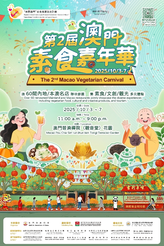 O “The 2nd Macao Vegetarian Carnival” tem lugar entre 3 e 7 de Outubro, na zona do Jardim de Kun Iam Tong, sob o tema “Explore o templo antigo”, com mais de 60 stands de comida vegetariana e indústrias culturais e criativas. No mesmo local, realizam-se espectáculos de património cultural intangível, actividades de pintura e caligrafia, jogos para pais e filhos, entre outras actividades, com vista a promover a cultura vegetariana.