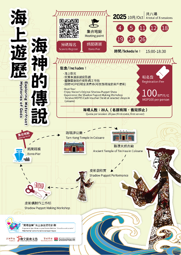 A “Exploring Waterfront Mysteries of Gods” realiza-se aos sábados e domingos, de 4 a 26 de Outubro, liderando os participantes a partir da Ponte-Cais da Barra. Depois de apreciarem a paisagem marítima, os participantes deslocam-se a Coloane para explorar o Templo de Tam Kong e o Templo de Tin Hau, num passeio para conhecer as lendas das divindades do mar únicas de Macau.