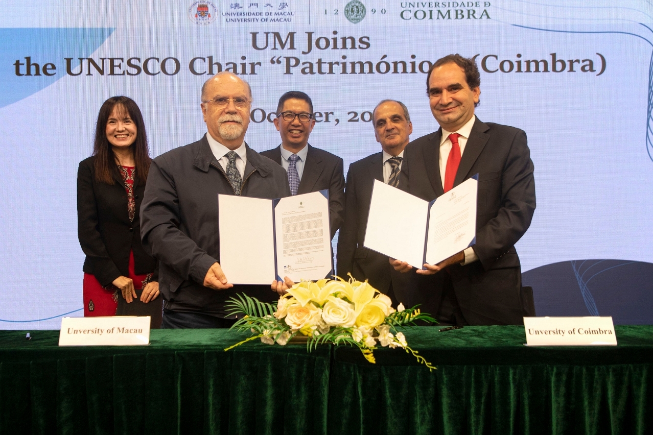 A Universidade de Macau (UM) e a Universidade de Coimbra realizaram a cerimónia de adesão à Cátedra UNESCO em Diálogo Intercultural em Patrimónios de Influência Portuguesa, assinalando a entrada formal da UM no projecto da Cátedra UNESCO lançado pela Universidade de Coimbra. Esta colaboração não só reforça os laços da UM com instituições de ensino superior dos países de língua portuguesa (PLP), como também imprime uma nova dinâmica no desenvolvimento da investigação sobre património cultural e na promoção do intercâmbio académico internacional em Macau.