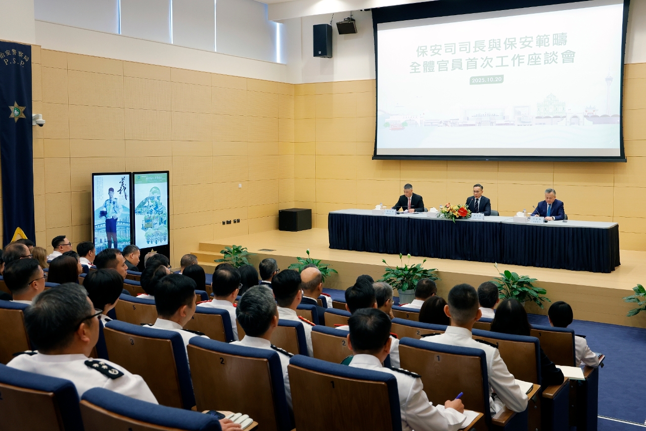 O Secretário para a Segurança, Chan Tsz King, presidiu a reunião de trabalho na área da segurança no Comando do Corpo de Polícia de Segurança Pública na manhã de ontem (dia 20), na qual estiveram presentes o Comandante-geral dos Serviços de Polícia Unitários, Leong Man Cheong, o Director-geral dos Serviços de Alfândega, Adriano Marques Ho, e todos os dirigentes e chefias da área da segurança. Nesta reunião, o Secretário Chan Tsz King fez um balanço sobre o trabalho e os resultados obtidos ao longo dos anos anteriores, transmitiu o conceito de governação e efectuou o planeamento sobre o rumo futuro dos trabalhos.