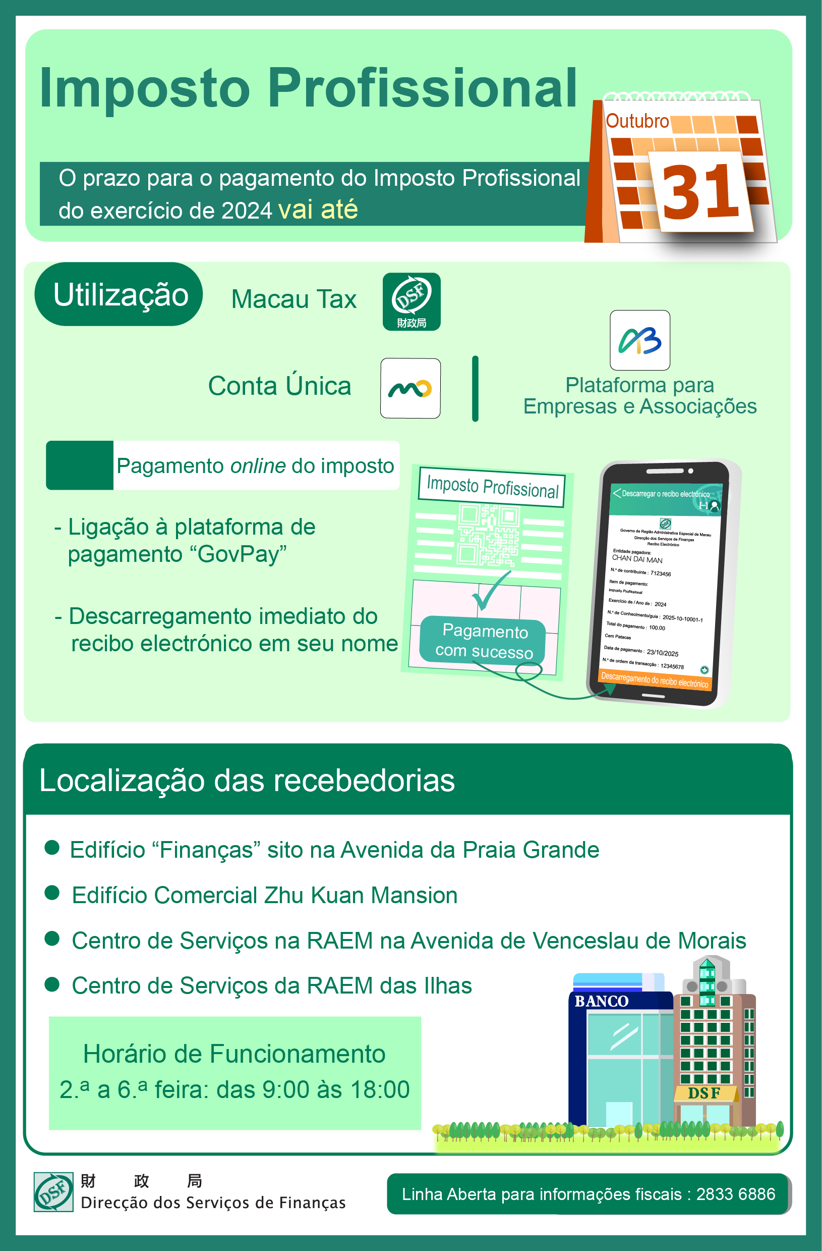 Os contribuintes podem também efectuar o pagamento do imposto nos balcões dos bancos designados, bem como, através das transacções electrónicas disponibilizadas pelos mesmos; ou ainda, proceder ao seu pagamento nas recebedorias do Edifício “Finanças” sito na Avenida da Praia Grande, do Edifício Comercial Zhu Kuan Mansion, do Centro de Serviços na RAEM na Avenida de Venceslau de Morais e do Centro de Serviços da RAEM das Ilhas.