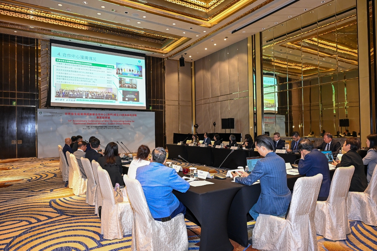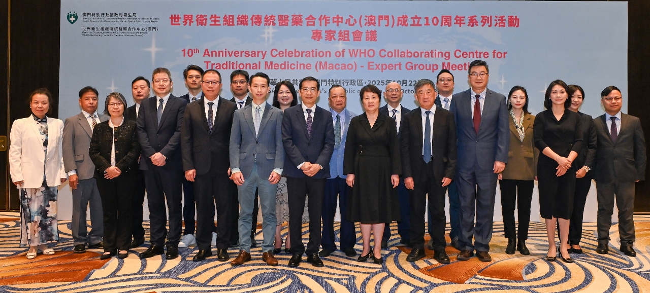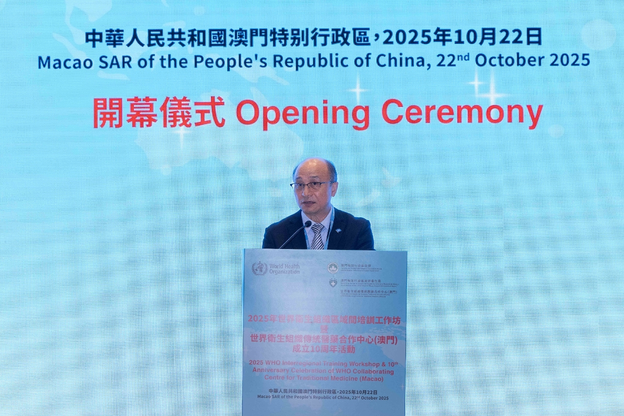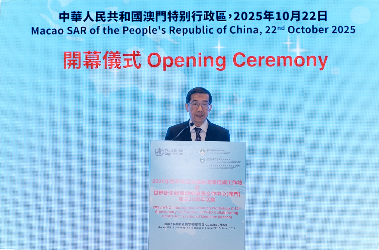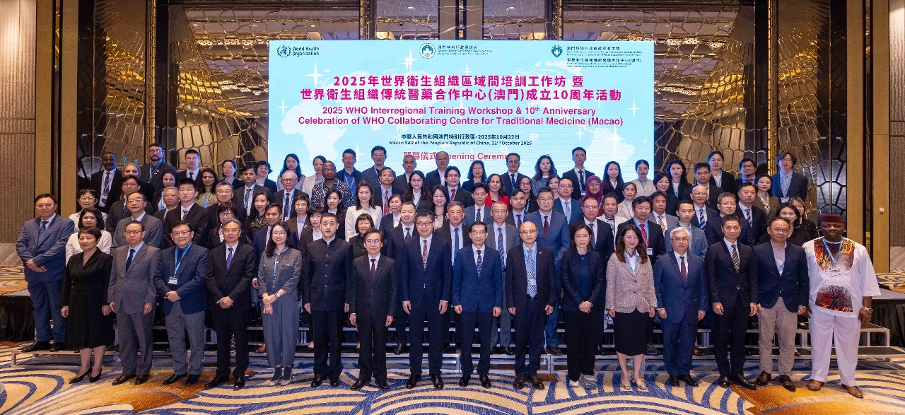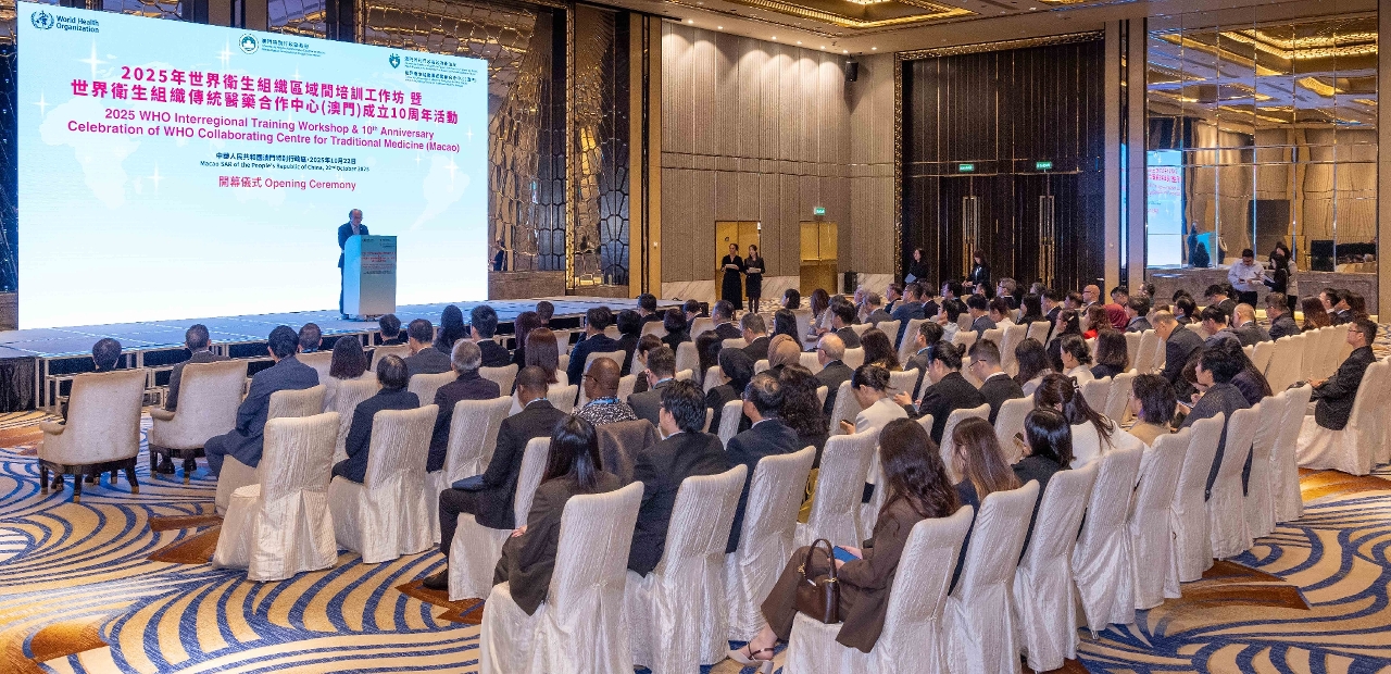 No âmbito das comemorações do "Dia Mundial da Medicina Tradicional", foi realizada, no dia 22 de Outubro, a cerimónia de abertura do "Workshop de Formação Inter-Regional da Organização Mundial de Saúde 2025 e das actividades comemorativas do 10.º aniversário do estabelecimento do Centro de Cooperação de Medicina Tradicional da Organização Mundial de Saúde (Macau)". A actividade é organizada pela Organização Mundial de Saúde (OMS), contando com a organização do Governo da Região Administrativa Especial de Macau. A cerimónia de inauguração contou com a participação de cerca de 100 pessoas, incluindo o director do Departamento de Propaganda e Cultura do Gabinete de Ligação do Governo Popular Central na RAEM, Wan Sucheng, o director do Departamento Geral do Comissariado do Ministério dos Negócios Estrangeiros da República Popular da China na Governo da Região Administrativa Especial de Macau (RAEM), Guo Xiaofeng, o chefe da Divisão de Medicina Tradicional, Complementar e Integração da OMS, Kim Sungchol, a assessora do Gabinete da Secretária para os Assuntos Sociais e Cultura do Governo da RAEM, Lu Hong, o director substituto dos Serviços de Saúde, Cheang Seng Ip, o presidente do Instituto para a Supervisão e Administração Farmacêutica, Choi Peng Cheong, o director substituto do Centro Hospitalar Conde de São Januário dos Serviços de Saúde, Tai Wa Hou, a directora do Hospital Kiang Wu, Ung Pui Kun, a directora do Centro de Cooperação de Medicina Tradicional da OMS (Macau), Mo Hui, os representantes e consultores da OMS, bem como os membros do Conselho para os Assuntos Médicos e representantes das associações de medicina tradicional chinesa de Macau.