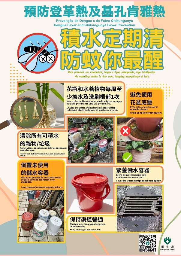 Face à persistência dos riscos de febre chikungunya e febre de dengue (duas febres) em Macau, os Serviços de Saúde e a Associação Geral dos Indústria de Limpeza de Serviço de Macau organizaram, no dia 22 de Outubro, uma palestra temática sobre a prevenção de mosquitos destinada ao pessoal de limpeza ao ar livre, com o intuito de aumentar a sua consciencialização para a prevenção de mosquitos. Durante a palestra, foram apresentadas de forma pormenorizada, nas línguas chinesa e inglesa, as caraterísticas, os mecanismos de transmissão das duas febres e as informações sobre a prevenção de mosquitos ao ar livre. O público-alvo principal foram os trabalhadores da limpeza ao ar livre, que receberam instruções sobre como identificar e eliminar as águas estagnadas comuns no ambiente. Foi ainda enfatizada a importância da atenção e da limpeza das águas estagnadas durante o trabalho, de modo a prevenir a proliferação de mosquitos. Adicionalmente, foram também divulgadas as medidas de reforço da prevenção individual contra mosquitos. A palestra contou com a participação de mais de quarenta trabalhadores que exercem funções de limpeza ao ar livre.