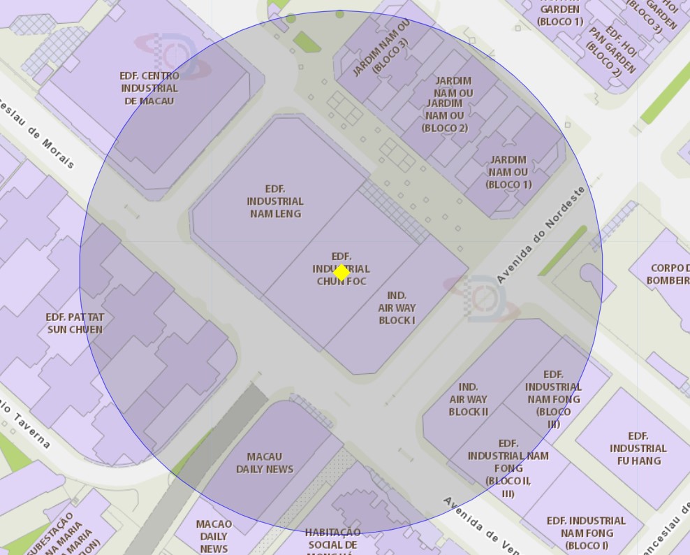 • 7. A área de um raio de 100 metros ao redor do edf. industrial chun foc da avenida de venceslau de morais 201-207, está delimitada como zona de risco