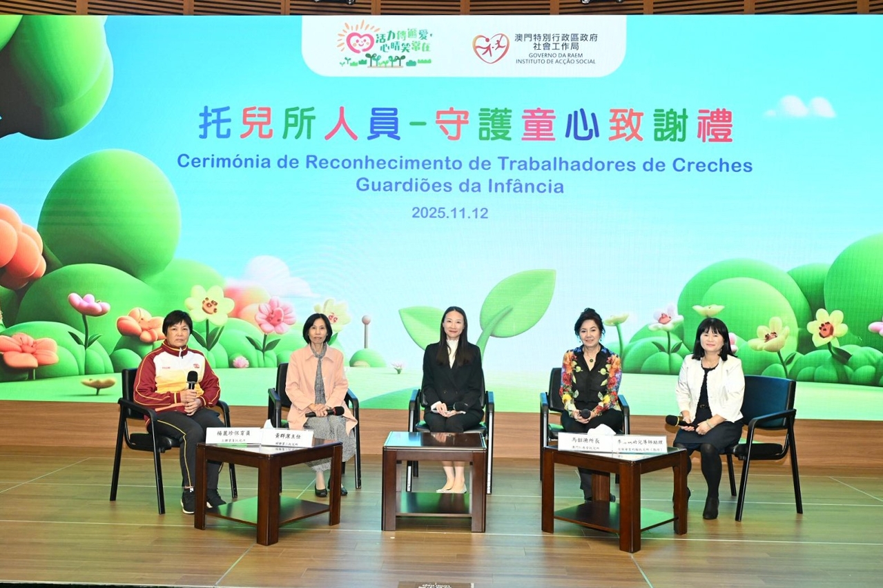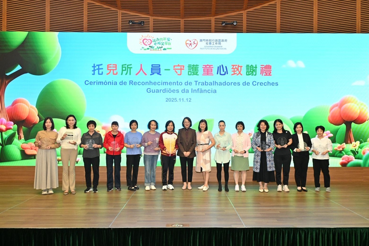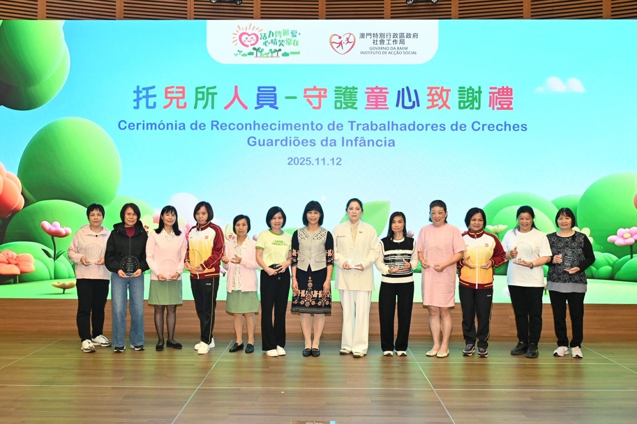 No dia 12 de Novembro, o Instituto de Acção Social (IAS) realizou a “Cerimónia de reconhecimento de trabalhadores de creches – guardiões da infância” no Salão de Convenções do Centro de Ciência de Macau. A cerimónia teve como tema “Cuidar de crianças com amor e servir com o coração”, durante a qual foram entregues certificados de reconhecimento a 49 trabalhadoras de creches com experiência entre 15 e 33 anos e reconhecidas pelas instituições de cuidados infantis onde trabalham, no sentido de lhes manifestar agradecimento pelo seu esforço e dedicação ao crescimento das crianças. O evento contou com a presença de cerca de 110 pessoas, incluindo representantes das entidades gestoras e creches relevantes.
