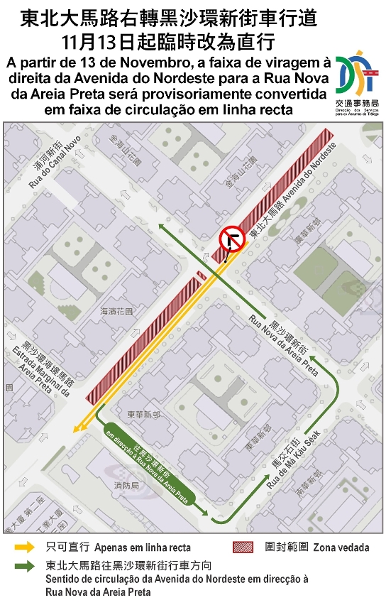 A Direcção dos Serviços para os Assuntos de Tráfego (DSAT) e o Corpo de Polícia de Segurança Pública (CPSP) têm vindo a acompanhar atentamente a situação do tráfego nas zonas envolventes e vias adjacentes durante a execução da obra de construção da travessia pedonal ao longo da Avenida do Nordeste. Tendo em conta que, durante o período da obra, cada sentido da Avenida do Nordeste dispõe apenas de duas faixas de rodagem, e após acompanhamento diário pelos dois serviços públicos, verifica-se que o cruzamento entre a Avenida do Nordeste e a Rua Nova da Areia Preta regista frequentemente estrangulamentos de tráfego. Para racionalizar a ordem de circulação nesse cruzamento, a partir das 7h00 da manhã do dia 13 de Novembro, a faixa de viragem à direita da Avenida do Nordeste em direcção à Rua Nova da Areia Preta passará a permitir apenas a circulação em frente, em direcção à Avenida Venceslau de Morais, com o objectivo de elevar a fluidez do tráfego no local.