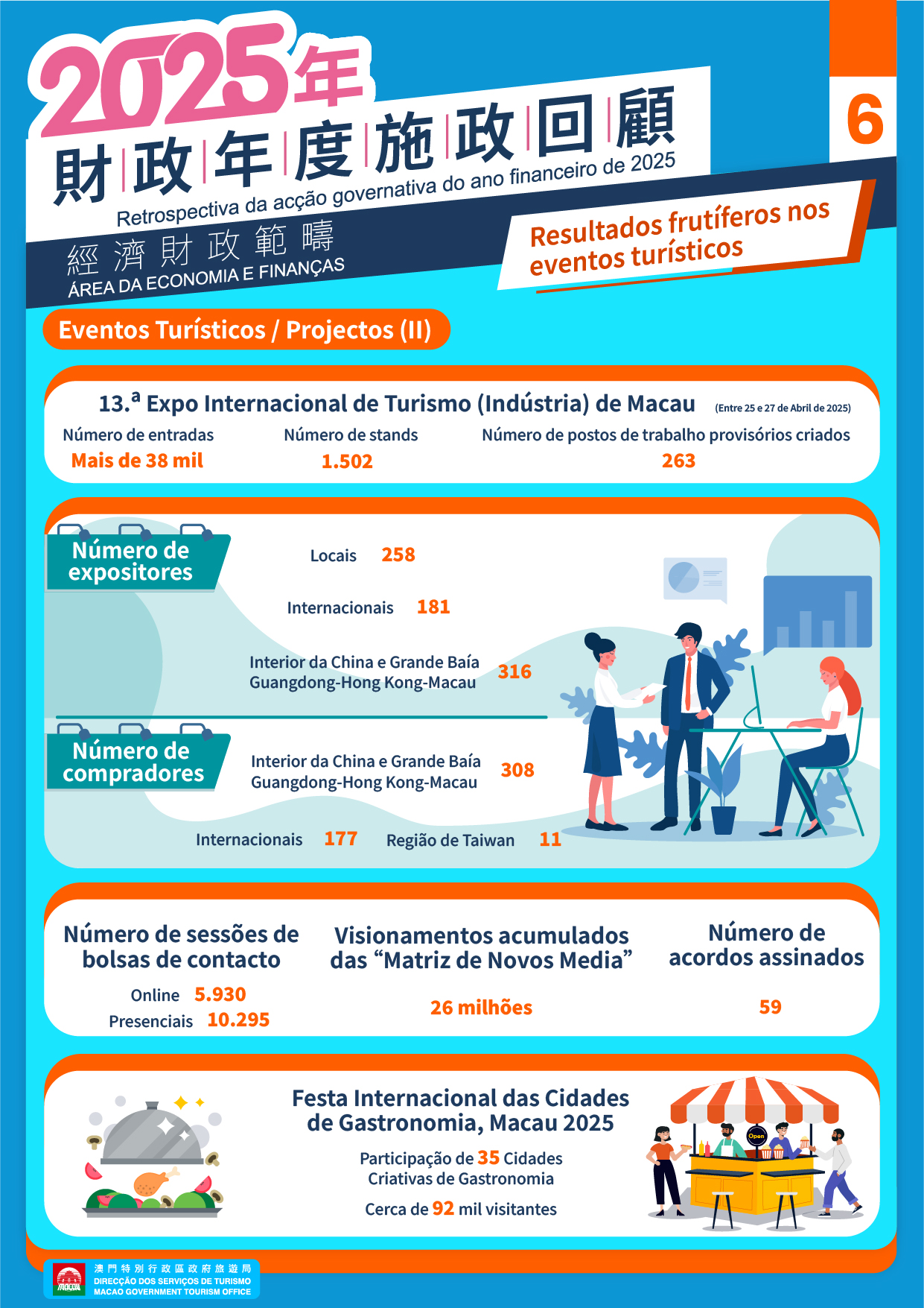 • “Turismo + Gastronomia”: Em Julho, a “Festa Internacional das Cidades de Gastronomia, Macau 2025” atraiu a participação de 35 Cidades Criativas de Gastronomia de todo mundo, o maior número de sempre, com o evento a contar com a participação de cerca de 92 mil pessoas.