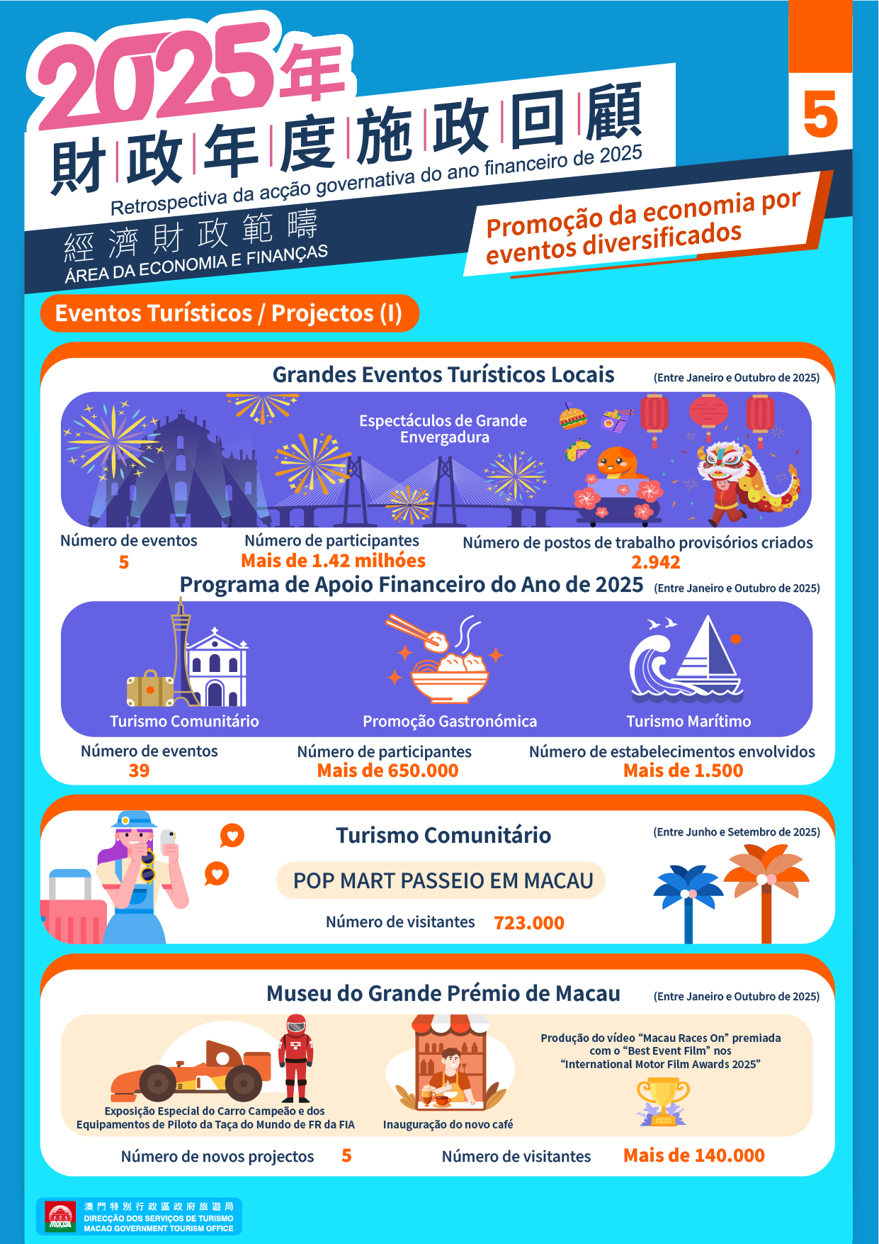 Através do Plano de Apoio Financeiro ao Turismo Comunitário, as associações foram incentivadas a realizarem actividades diversificadas. Em 2025 foram aprovados um total de 54 projectos, dos quais 39 foram concluídos até Outubro, tendo atraído mais de 650 mil participantes e envolvido mais de 1.500 estabelecimentos comerciais. O programa “POP MART PASSEIO EM MACAU” atraiu 723 mil visitantes, estimulando o consumo turístico.