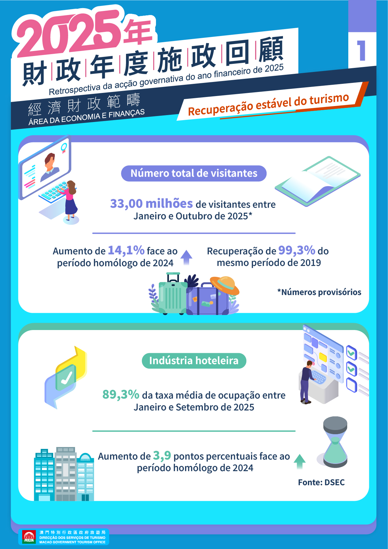 De acordo com números preliminares, entre Janeiro e Outubro de 2025 Macau recebeu um total de 33 milhões de visitantes, um aumento homólogo de 14,1%, retomando em 99,3% os valores registados no mesmo período de 2019. O número de visitantes internacionais continuou a crescer, tendo atingido 2,15 milhões, num aumento de 13,6% em termos homólogos. Durante a “semana dourada” do Dia Nacional, o número médio de visitantes foi de 143 mil por dia, tendo atingido 191 mil no dia 4 de Outubro, um novo recorde durante os feriados do Dia Nacional. A taxa de ocupação média dos hotéis e similares no período de Janeiro a Setembro deste ano foi de 89,3%, mais 3,9 pontos percentuais, face ao mesmo período do ano passado.