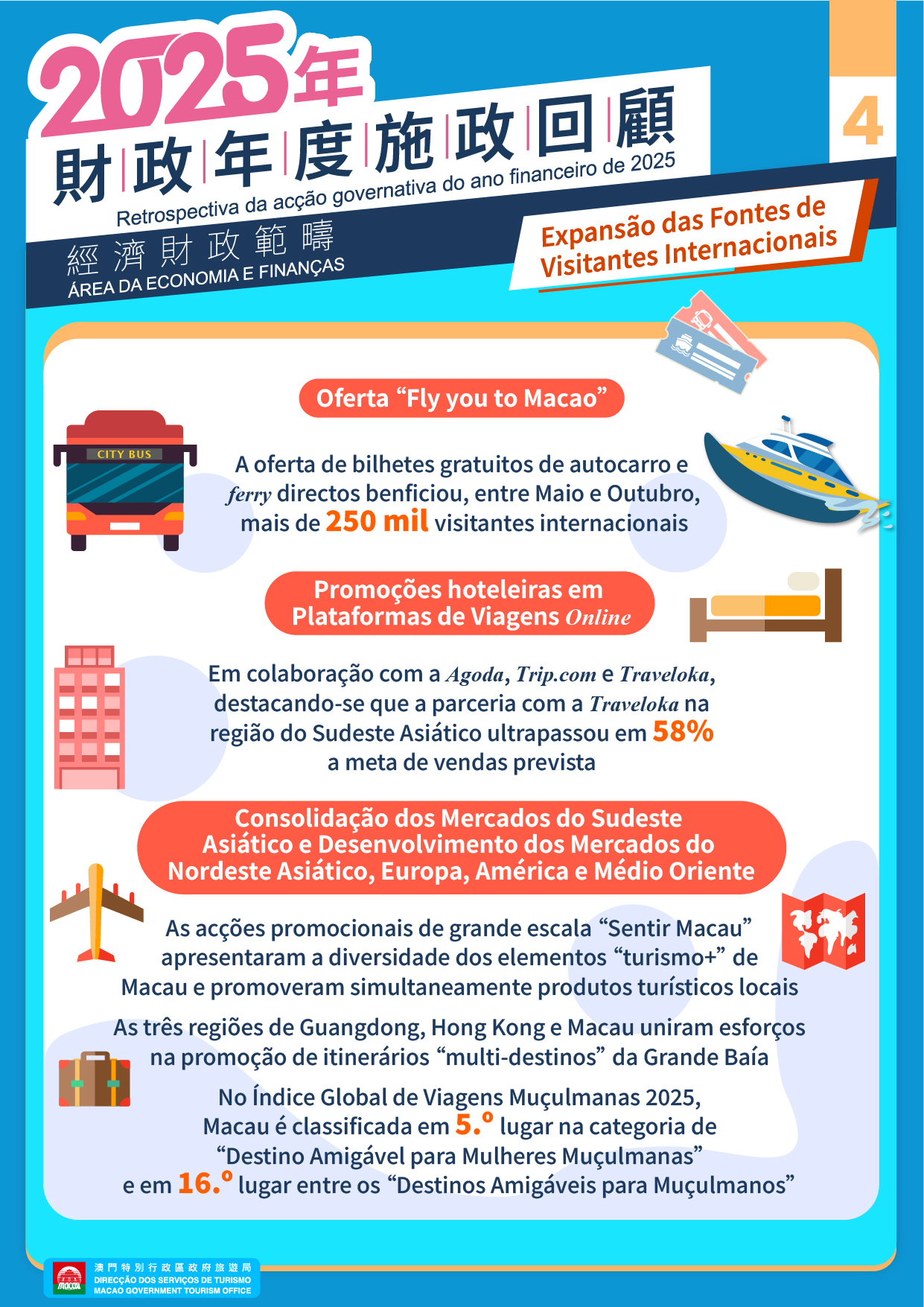 Para concretizar os objectivos definidos no Relatório das Linhas de Acção Governativa para o ano de 2025, no sentido de reforçar as vantagens do sector do turismo e lazer integrado, aprofundar o desenvolvimento intersectorial do “turismo +” e explorar activamente fontes de visitantes internacionais, a Direcção dos Serviços de Turismo (DST) tem promovido activamente acções conjuntas com os operadores turísticos locais, tendo vindo a desenvolver a integração aprofundada dos elementos do turismo, gastronomia, convenções e exposições, eventos e desporto, a reforçar, de forma contínua, a divulgação global e a mostrar, em todas as suas vertentes, o encanto singular de Macau como um centro mundial de turismo e lazer.